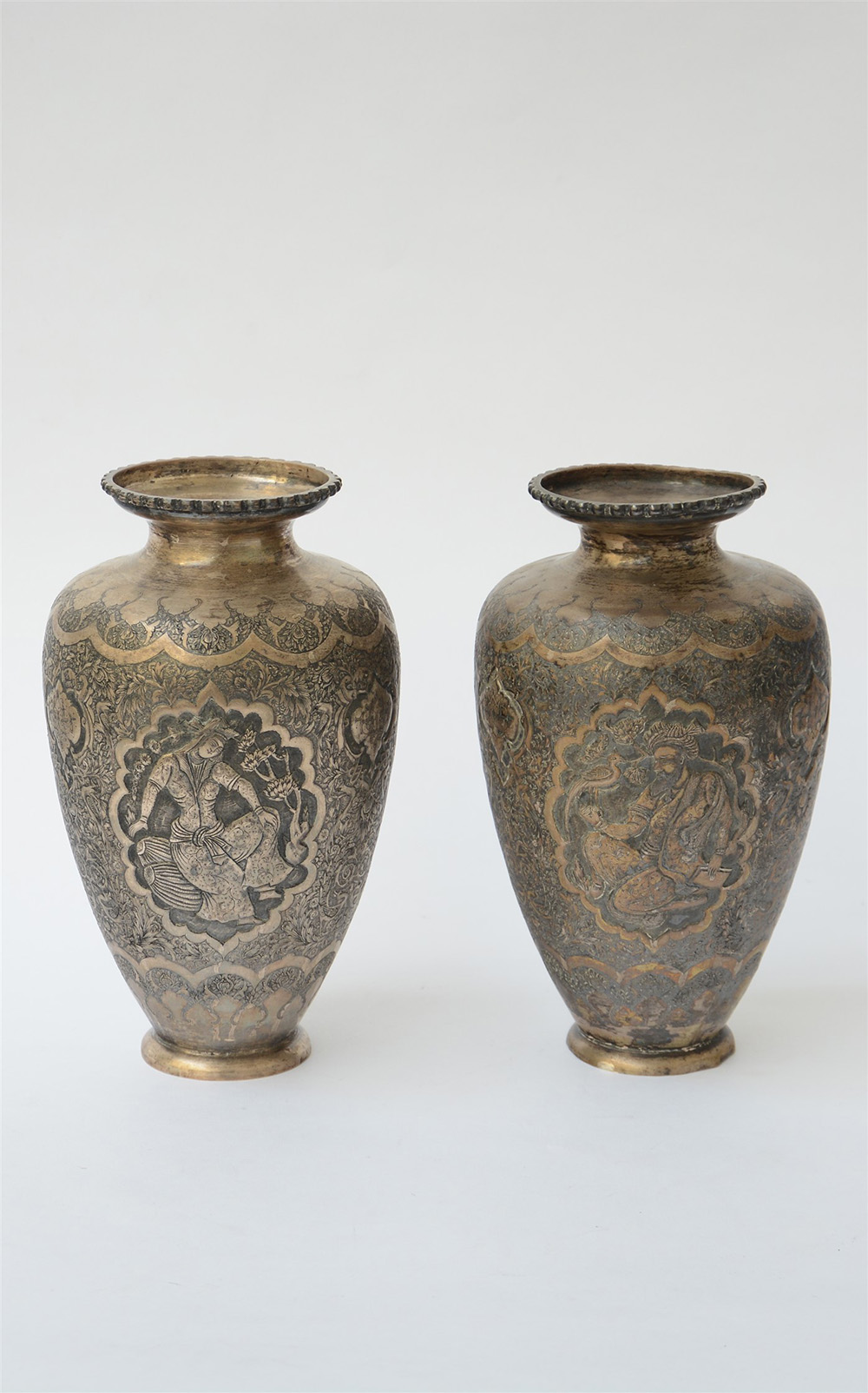Coppia di vasi di manifattura orientale in metallo argentato e decorato a volute e figure (difetti)