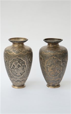 Coppia di vasi di manifattura orientale in metallo argentato e decorato a...