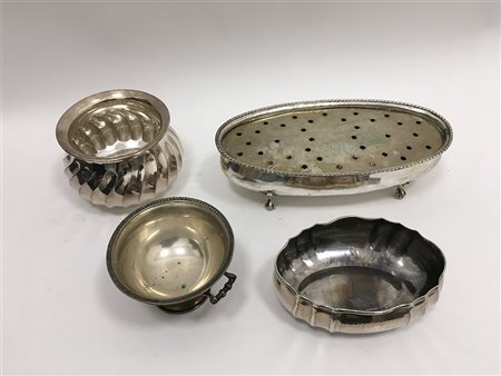 Lotto composto da una coppa biansata, due vaschette di forma ovale ed un vaso polilobato, in argento (gr 1450 ca)(difetti)