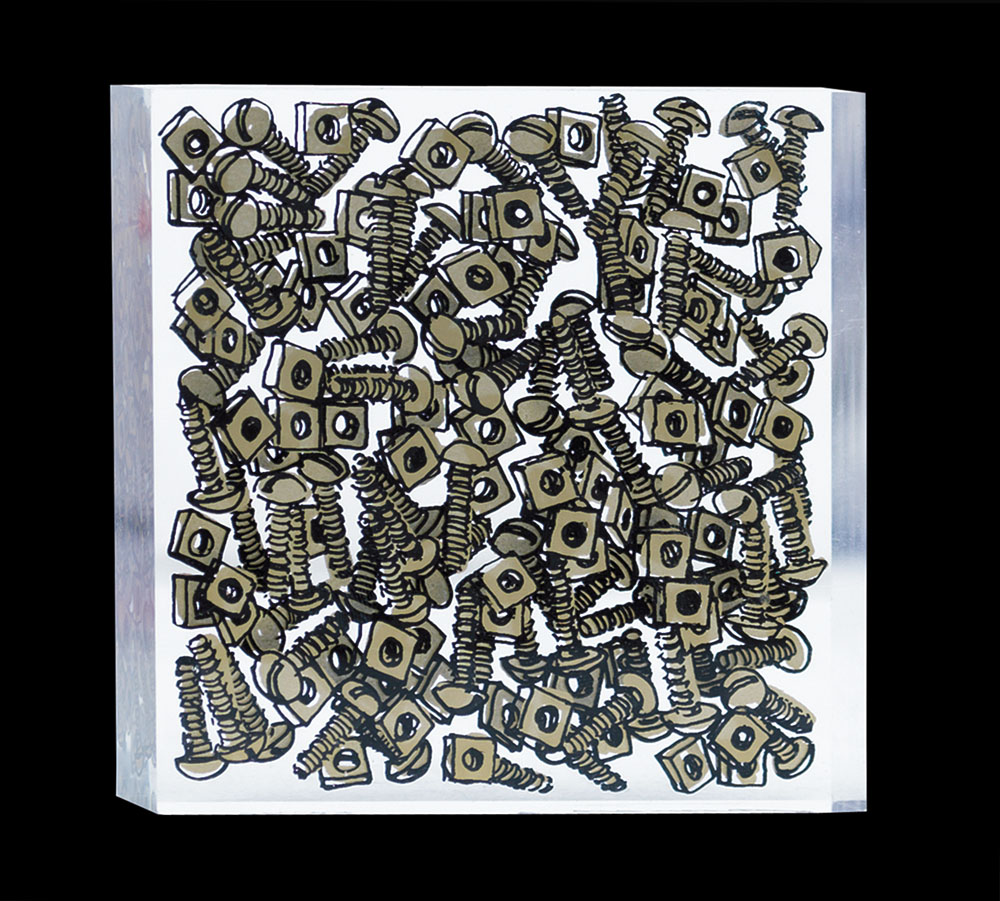 ARMAN Nizza 1928 - New York 22/10/2005 - Schrauben, 1981/82, serigrafia di viti e bulloni entro plexiglass cm. 10x10x3, esemplare 55/99, firma e tiratura su un bordo, dichiarazione d'autenticità della Galleria Pace (MI) su foto.