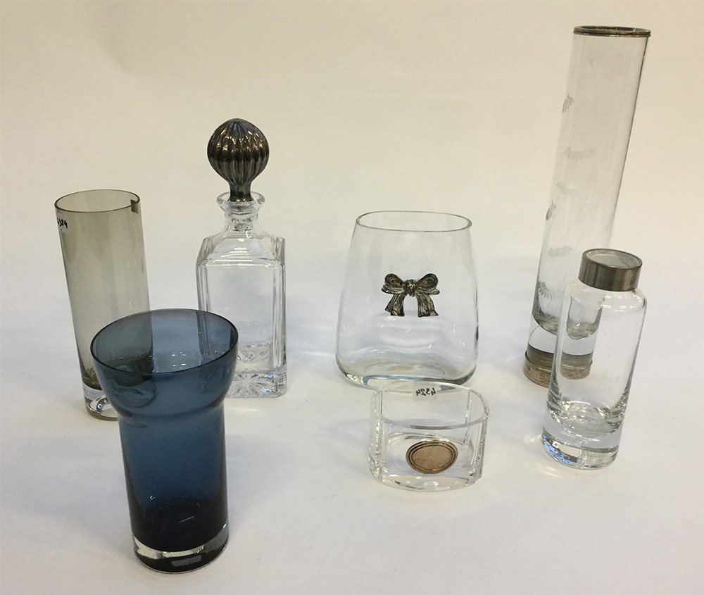 Lotto composto da cinque vasi portafiori, una bottiglia con tappo è una ciotola ovale in vetro e cristallo, alcuni con applicazioni in metallo e argento (difetti)