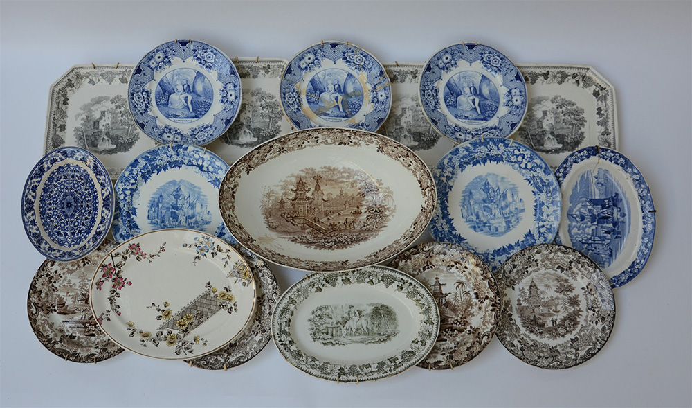 Manifatture diverse. Lotto composto da otto piatti ed una alzata in ceramica decorati in monocromia (difetti)