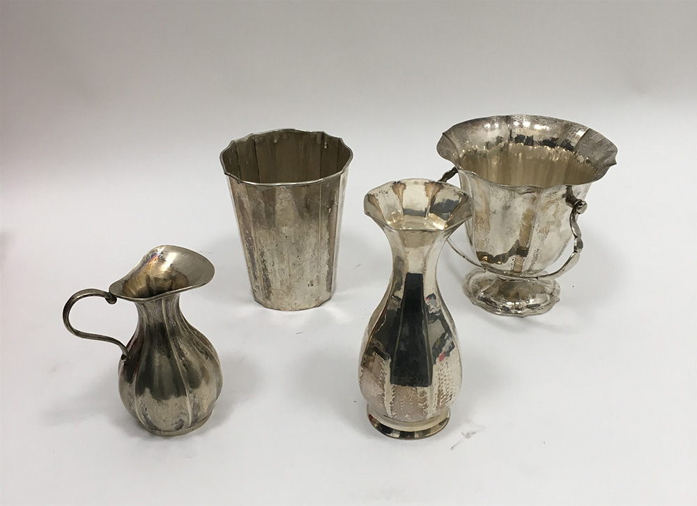 Lotto composto da un secchiello con manico,un vasetto portafiori, una brocca ed un contenitore, in argento (gr 1020 ca)(difetti)