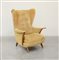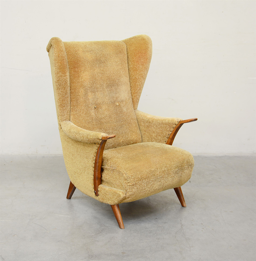 Poltrona a orecchioni rivestita in velluto color senape, con montanti curvi. Anni '50/'60 del sec. XX (difetti)