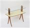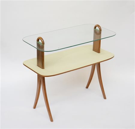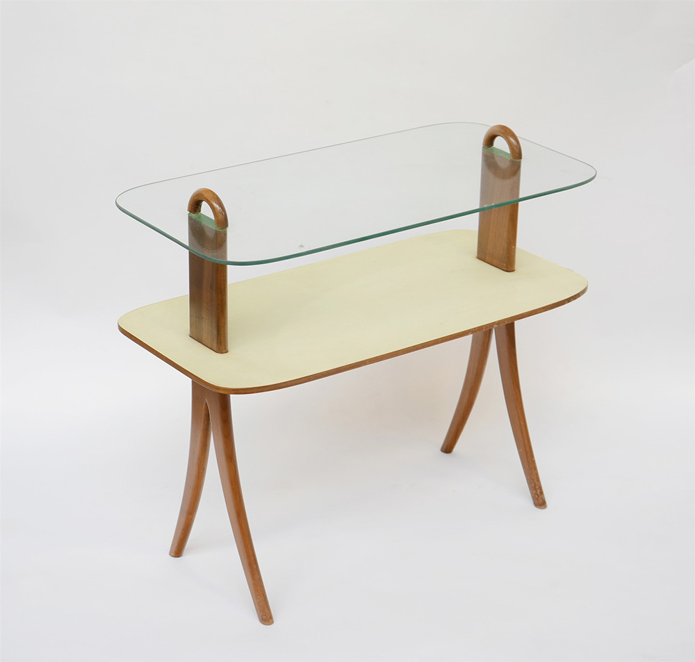 Tavolino da salotto a due ripiani in vetro e legno, gambe curve, anni '60 del sec. XX (cm 66x54x32)(Difetti)