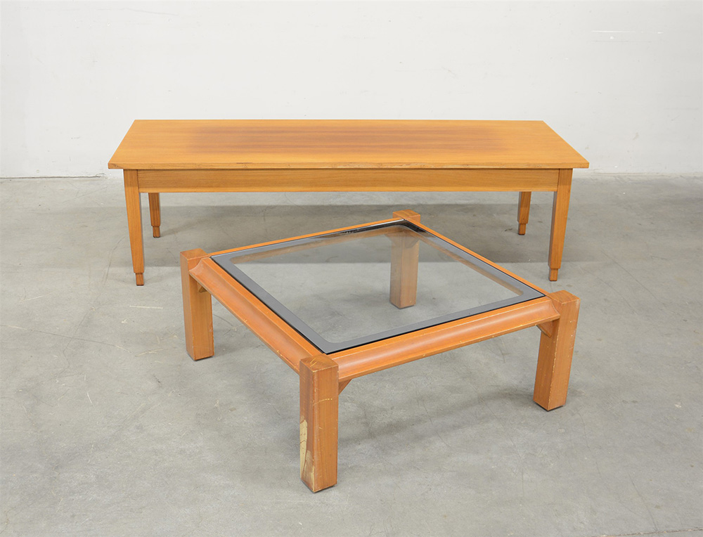 Lotto composto da due tavolini da salotto in legno, uno rettangolare e uno quadrato con piano in vetro (difetti)