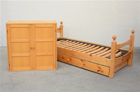 Lotto composto da un lettino singolo con lettino estraibile e un mobiletto a due ante in legno (difetti)