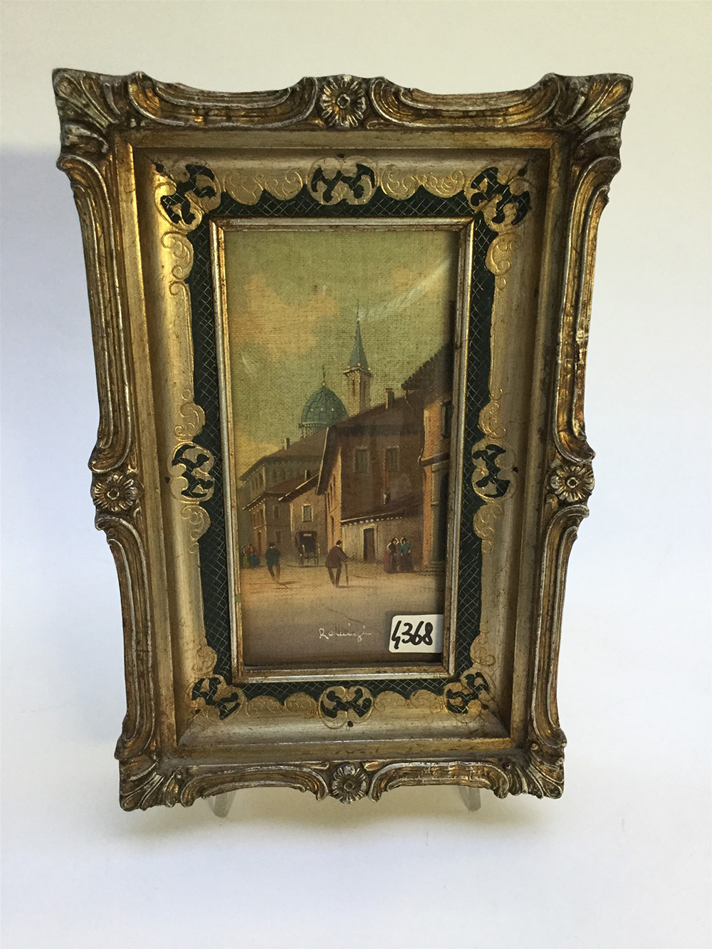Ignoto "Scorcio di città " olio su cartone telato (cm 18x9) reca firma Romigi in basso al centro, in cornice (difetti)