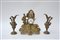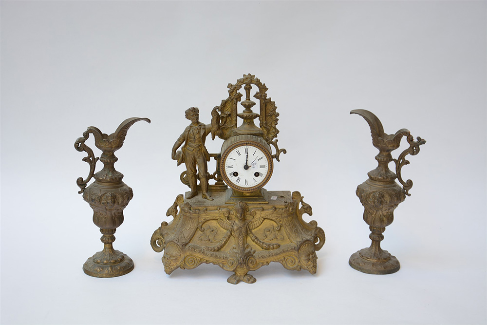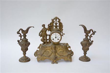 Lotto composto da una pendola da tavolo decorata con figura di cacciatore a tutto tondo con quadrante smaltato a numeri romani e una coppia di versatoi decorati con teste di putti, in metallo dorato (difetti e mancanze)