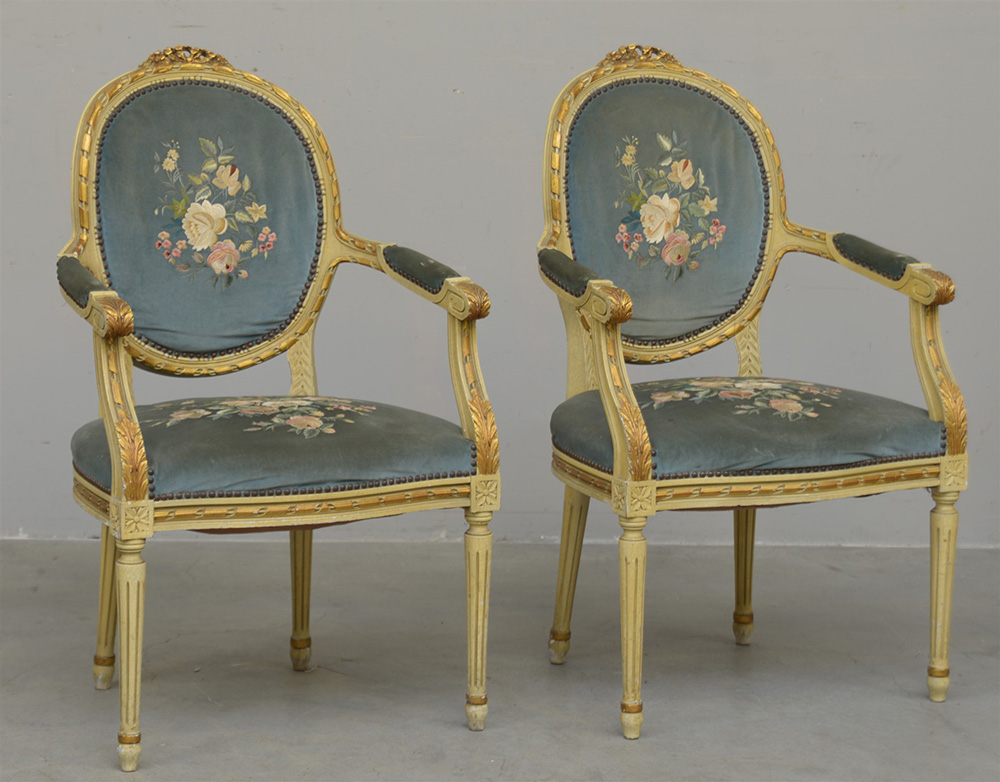 Coppia di poltroncine in stile "Luigi XVI" in legno laccato, dorato e intagliato rivestite in tessuto ricamato a fiori(difetti)