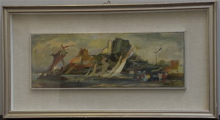 Dino Rossi "Al porto" olio su tela (cm 18x46) firmato in basso a destra in...