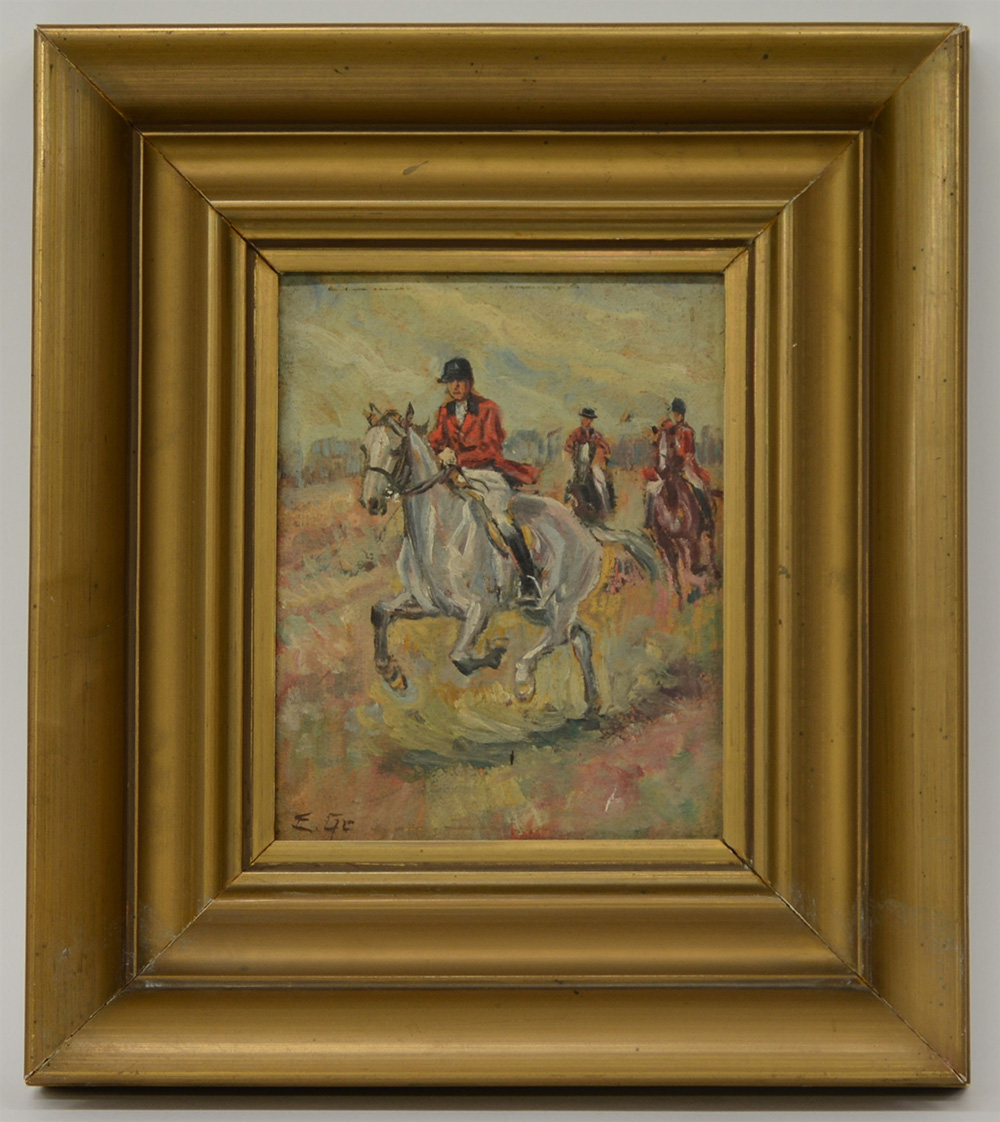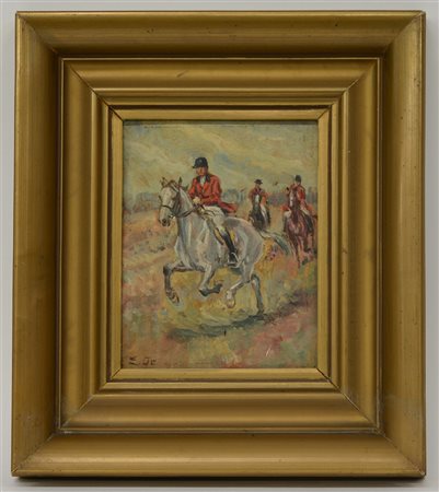 Ignoto "Caccia alla volpe" olio su cartone (cm 16,5x13) sigla indecifrata in basso a sinistra, in cornice (difetti)