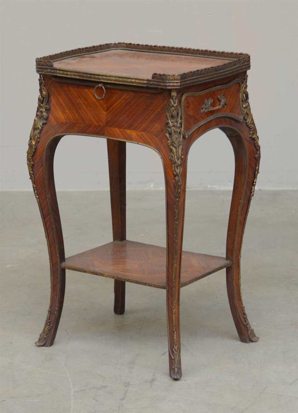 Mobiletto di forma sagomata interamente lastronato, un cassetto laterale e un giretto sottopiano, gambe sagomate riunite da pianetto, fregi in metallo dorato (cm 42x70x32)(difetti)