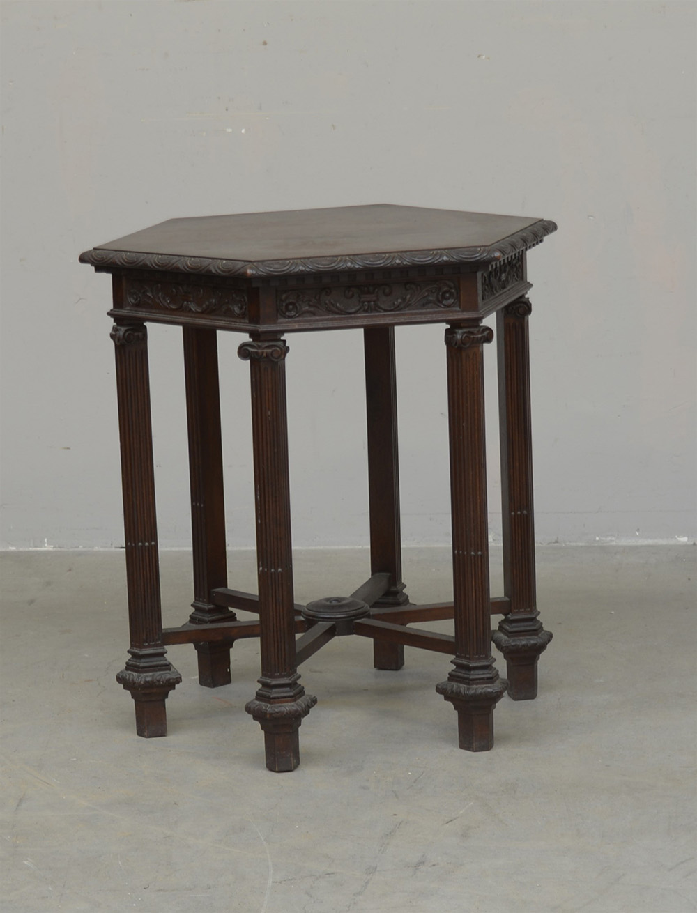 Tavolino in legno con piano esagonale apribile, intagliato a motivi vegetali,...