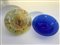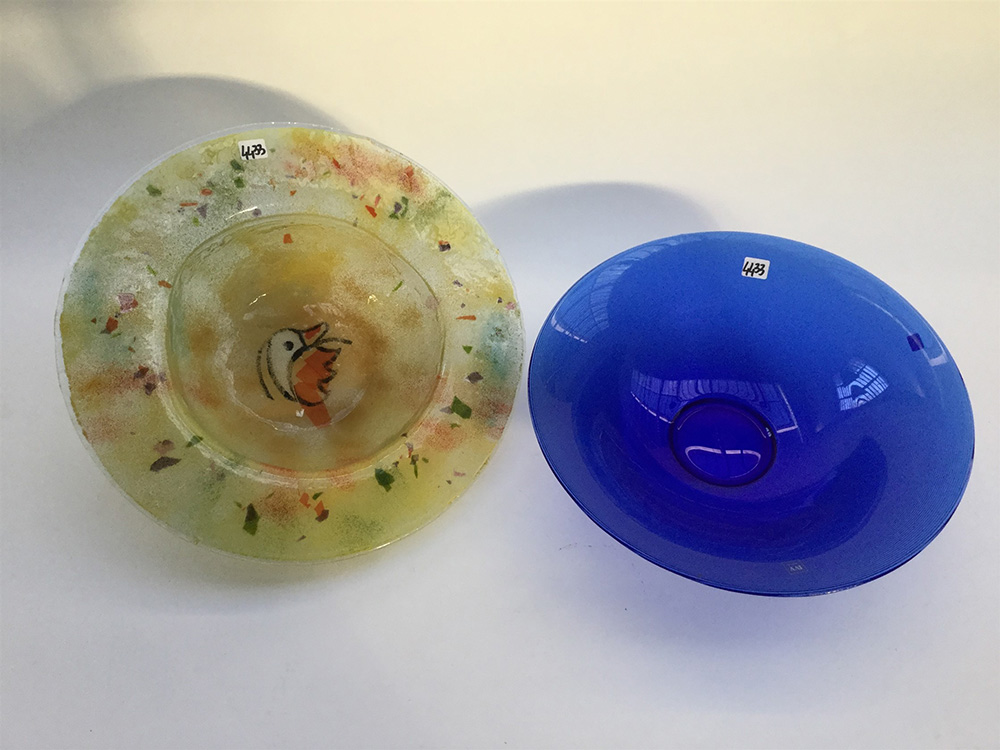 Lotto composto da un centrotavola in vetro decorato in policromia ed uno in vetro blu dec a striature di manifatture diverse (difetti)