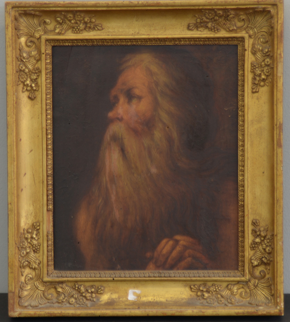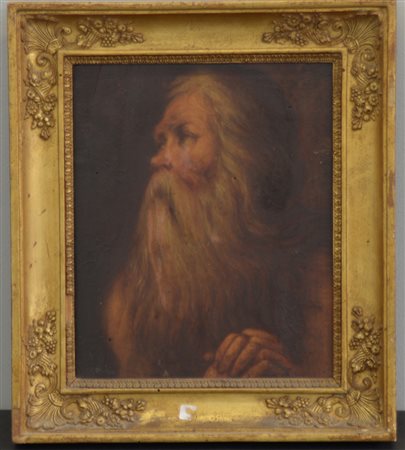 Scuola del secolo XIX "Volto di anziano con barba" olio su tavola (cm 23,5x18,5) in cornice dell'epoca in legno intagliato e dorato decorata da fregi agli angoli (difetti)