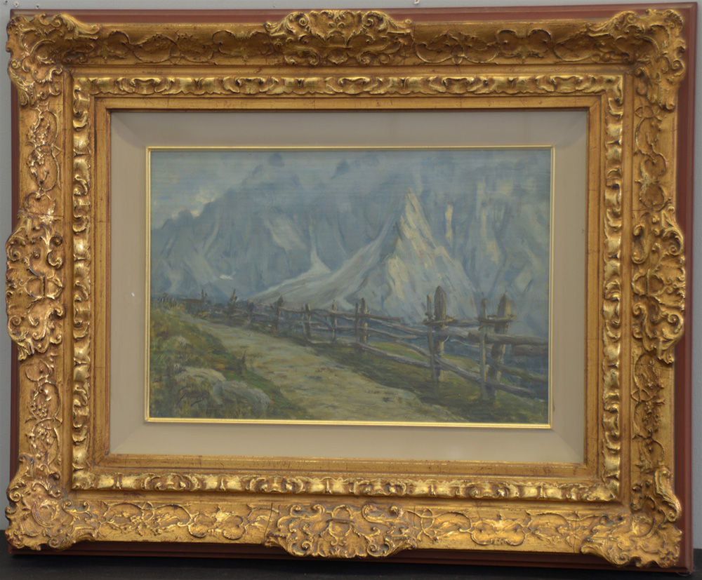 Danieli Giuseppe (Belluno 1865 - Verona 1931) "Valle D'Aosta" olio su tavola (cm 27,5x40,5) firmato in basso a sinistra, in cornice. Al retro etichetta e timbri della "Galleria d'arte Pirra -Torino" e timbro con autentica di Rina Danieli (difetti)