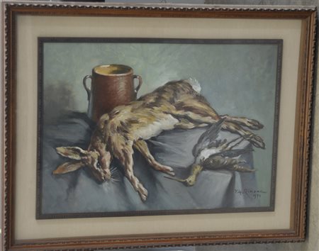 Francesco Rinone "Cacciagione" 1971 olio su tela (cm 50x70) firmato e datato in basso a destra, in cornice (difetti)