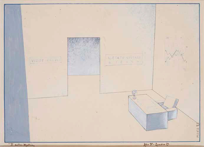 Bruno Munari Milano 1907 – 1998 Bozzetto di scena per il dramma futurista “Il Dottor Mattia” di Angelo Rognoni, Teatro Nuovo, Compagn ia di Ettore Gian Ferrari, Milano, 10 maggio 1931 Atto 3°, Quadro 2°, 1931 acquarello su cartoncino, cm 24x32. Firmato in basso a lato sulla destra: Munari Titolato in basso a sinistra: Il dottor Mattia Iscritto in basso a destra: Atto 3° - Quadro 2° Esposizioni: Pavia, Assessorato alla Cultura, Futurismo pavese, marzo 1983; Francoforte, Schirn Kunsthalle Frankfurt, Die Maler 40 und Das Theater im 20 Jahrhundert, marzo-maggio 1986; Milano, Palazzo Reale, Cesare Andreoni e il futurismo a Milano tra le due guerre, gennaio-marzo 1993. Bibliografia: R. Bossaglia, S. Zatti, Futurismo pavese, Ed. Ticinum, Pavia 1983, p. 80; Maler und Das Theater im 20 Jahrhundert, catalogo della mostra, Francoforte 1986, n. 246, p. 284 riprodotto; G. Lista, Les Futuristes, Editions Henri Veyrier, Parigi 1988, p. 75 riprodotto; G. Lista, La Scène futuriste, Editions du Centre National de la Recherche Scientifique, Parigi 1989, p. 253; G. Lista, Lo Spettacolo futurista, Cantini Editore, Firenze 1990, p. 119 riprodotto; Cesare Andreoni e il futurismo a Milano tra le due guerre, catalogo della mostra, a cura dell’Archivio Cesare Andreoni, Ed. Bolis, Bergamo 1993, n. 19, p. 33 riprodotto