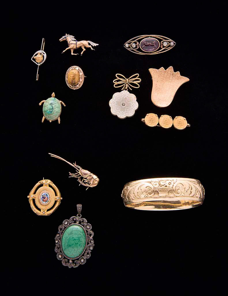Lotto composto da: - ciondolo in argento con malachite, gr. 16,30; - ciondolo in argento raffigurante San Giorgio e il Drago, gr. 13,70; - spilla in oro giallo con fiori dipinti, gr. 5,00; - clip in oro giallo raffigurante aragosta, gr. 3,00.