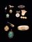 Lotto composto da: - spilla in oro giallo con ametista e quattro brillanti, gr. 10,60; - spilla in oro giallo con tre monete, gr. 8,30; - spilla-ciondolo in oro giallo a forma di campanula, gr. 9,30; - spilla fiocco in oro giallo con ciondolo raffigurante pizzo, gr. 11,80.