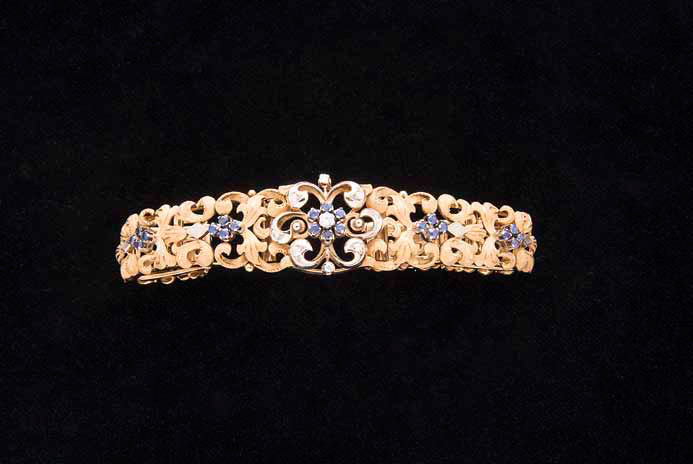 Bracciale in oro giallo e bianco con n. 9 brillanti del peso complessivo di ct. 0,20 ca, e zaffiri, gr. 47,34, lunghezza cm 18.