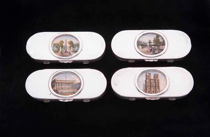 Lotto composto da quattro tabacchiere in argento e miniature raffiguranti Monumenti francesi.