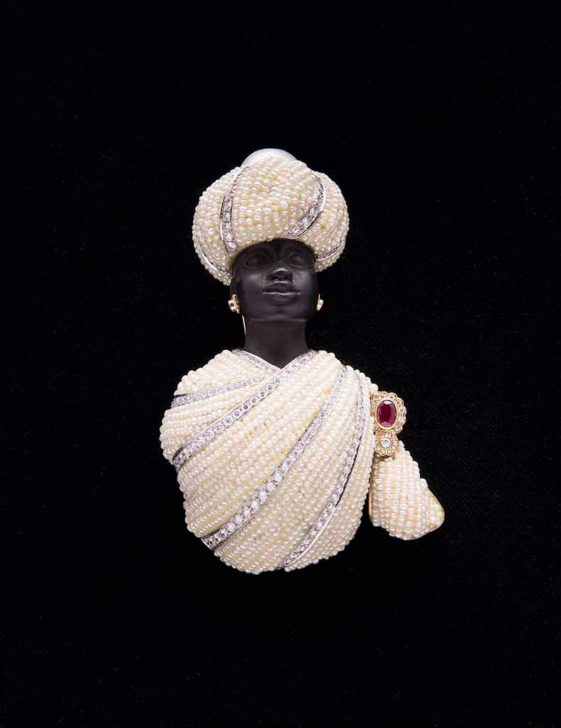 Spilla a forma di Moro in oro giallo e bianco con brillanti, micro perle e rubino, gr. 86, firmata: A. Codognato