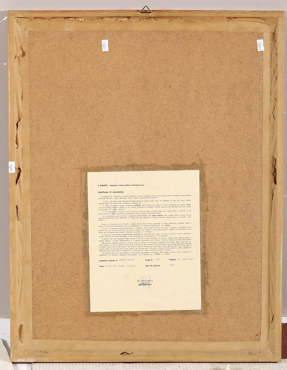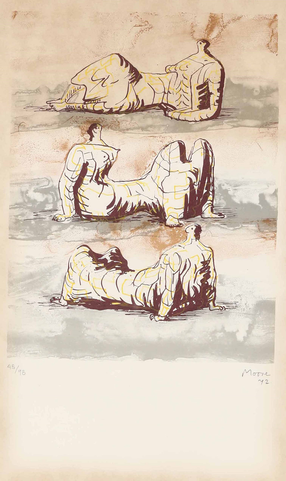 Henry Moore (1831-1895), Three reclining figures, 1972, litografia a colori, cm 65x50 firmata e datata in basso a destra es. 45/95 95 esemplari numerati da 1 a 95 e 10 prove d’artista Al retro certificato di autenticità Stamperia d'Arte Grafica Contemporanea il Bisonte, Firenze, Bibliografia: Patrick Cramer, L’opera grafica di Henry Moore. Catalogo ragionato, Gérald Cramer Editore, Ginevra, 1973 n. 183