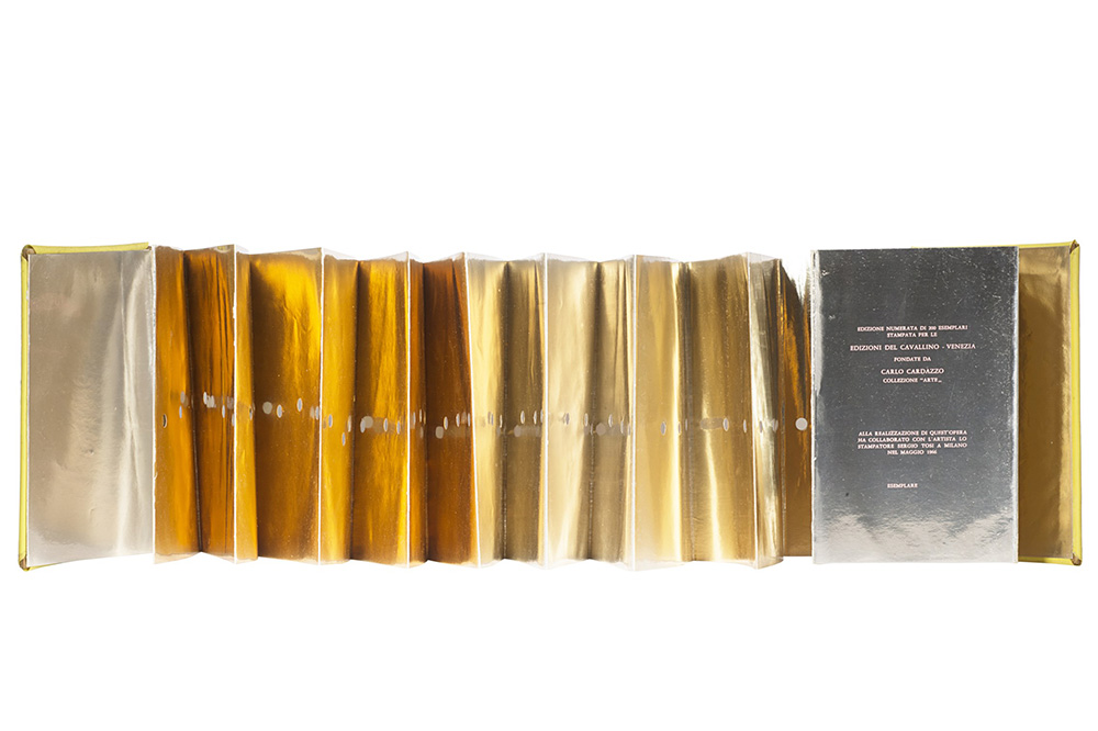 album pieghevole in carta oro con buchi, avvolto in una copertina in vinile giallo