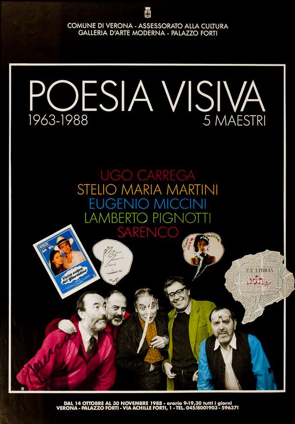 Poesia Visiva Poesia Visiva – 1988 collage su manifesto cm. 100x70 Firma in basso a sx Manifesto della mostra "5 Maestri" tenutasi a Palazzo Forti, Verona, sul quale i 5 artisti Sarenco, Ugo Carrega, Lamberto Pignotti, Stelio Maria Martini ed Eugenio Miccini hanno eseguito ciascuno e firmato un collage originale