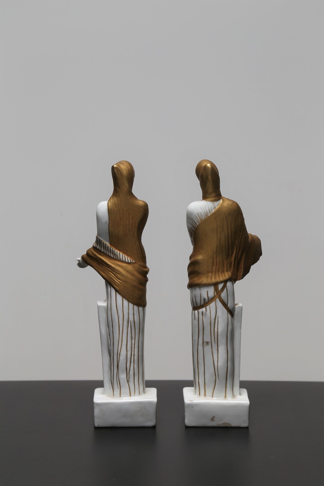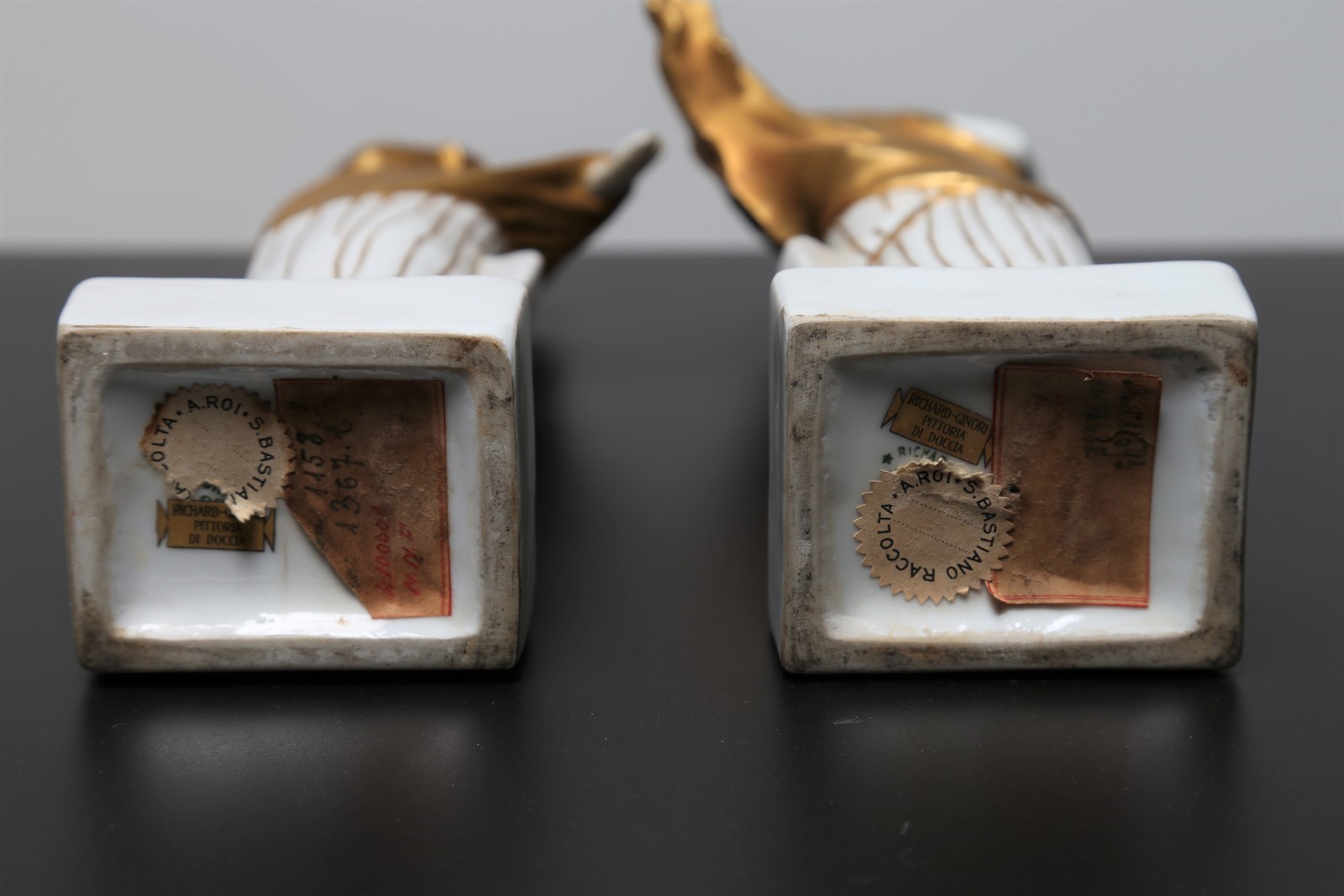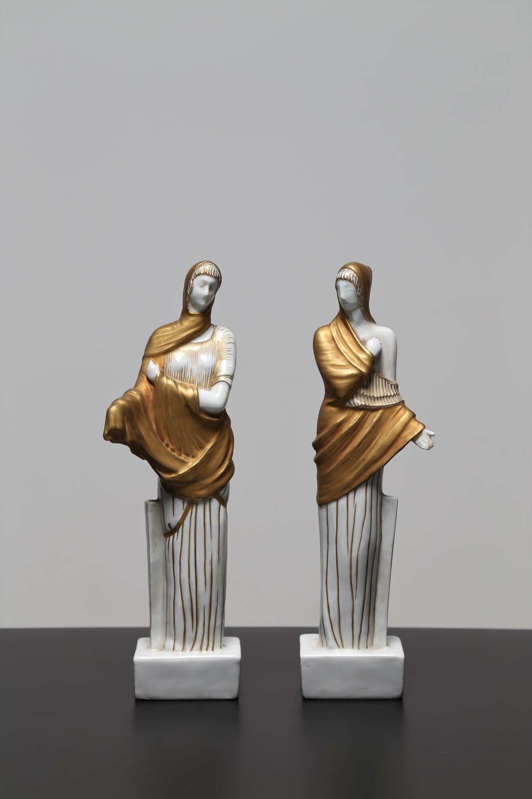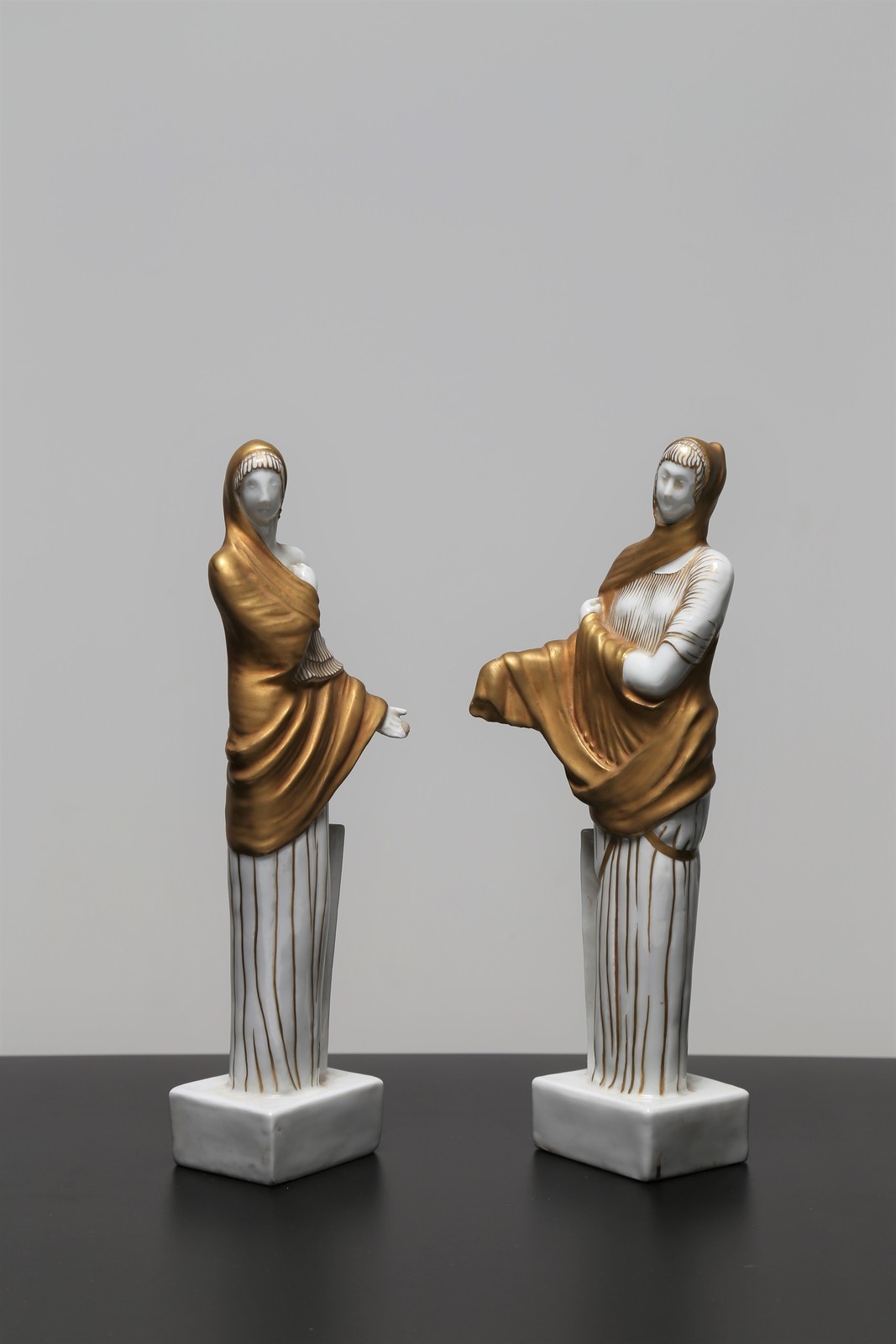 . . Cm 28,50. Inedita coppia di vestali in porcellana, decorate in oro e modellate da Italo Griselli, in serie limitata, tra il 1928/32 anni in cui risale la collaborazione con l'architetto milanese Giò Ponti e la pittoria di Doccia della Società ceramica Richard-Ginori. Un esemplare della stessa coppia è conservato nel Museo Richard-Ginori della manifattura di Doccia. Sotto la base sono presenti il marchio della manifattura e l’etichetta della collezione di provenienza. Firma del modellatore in basso al retro di una delle due porcellane. Piccola mancanza ad una mano.