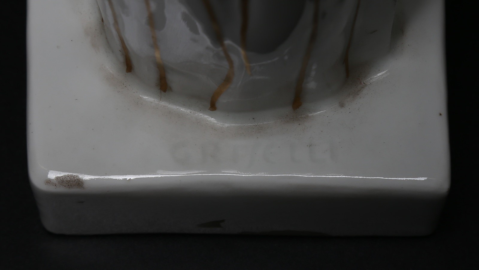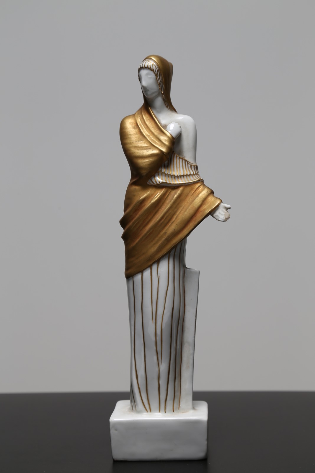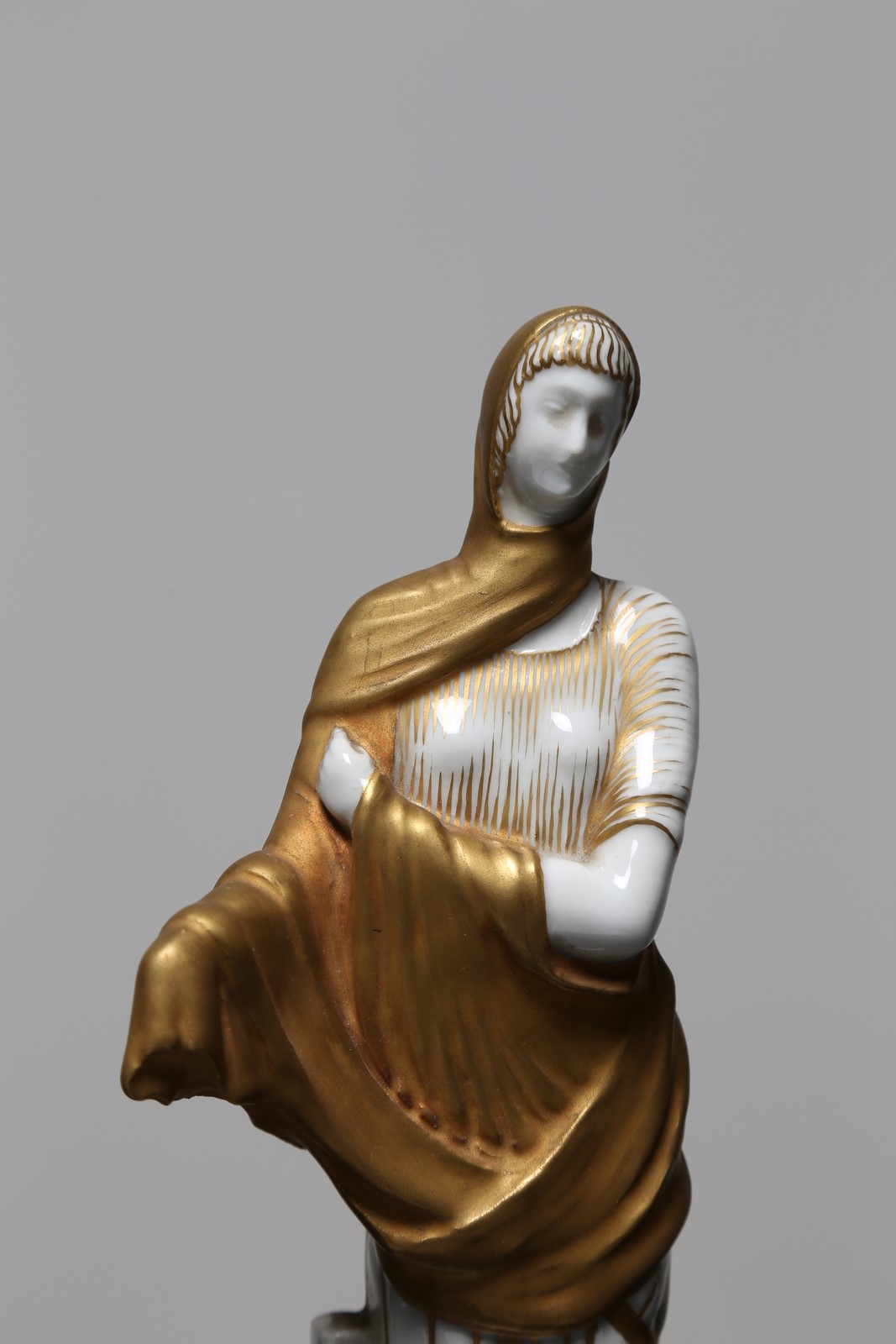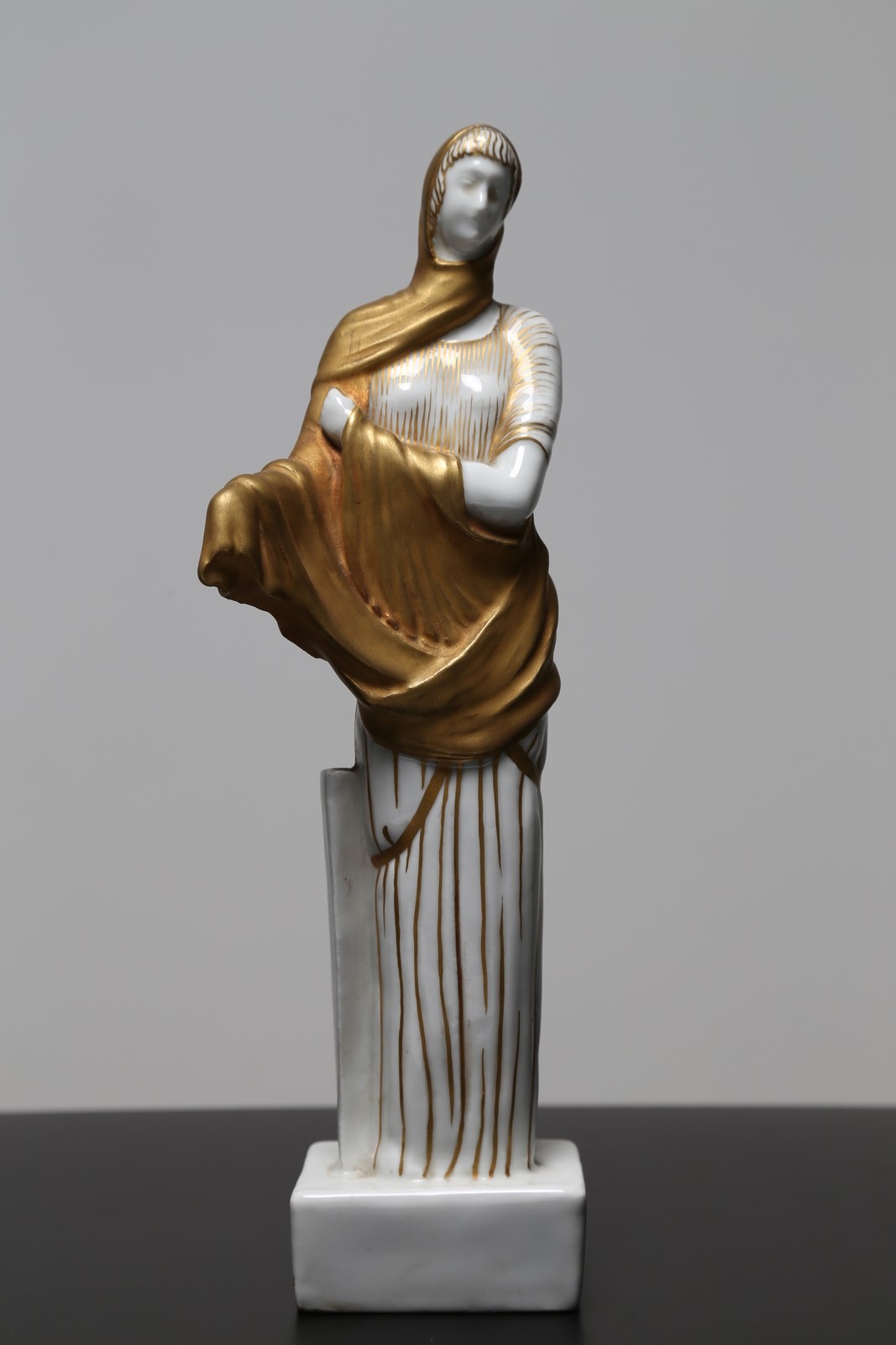 . . Cm 28,50. Inedita coppia di vestali in porcellana, decorate in oro e modellate da Italo Griselli, in serie limitata, tra il 1928/32 anni in cui risale la collaborazione con l'architetto milanese Giò Ponti e la pittoria di Doccia della Società ceramica Richard-Ginori. Un esemplare della stessa coppia è conservato nel Museo Richard-Ginori della manifattura di Doccia. Sotto la base sono presenti il marchio della manifattura e l’etichetta della collezione di provenienza. Firma del modellatore in basso al retro di una delle due porcellane. Piccola mancanza ad una mano.