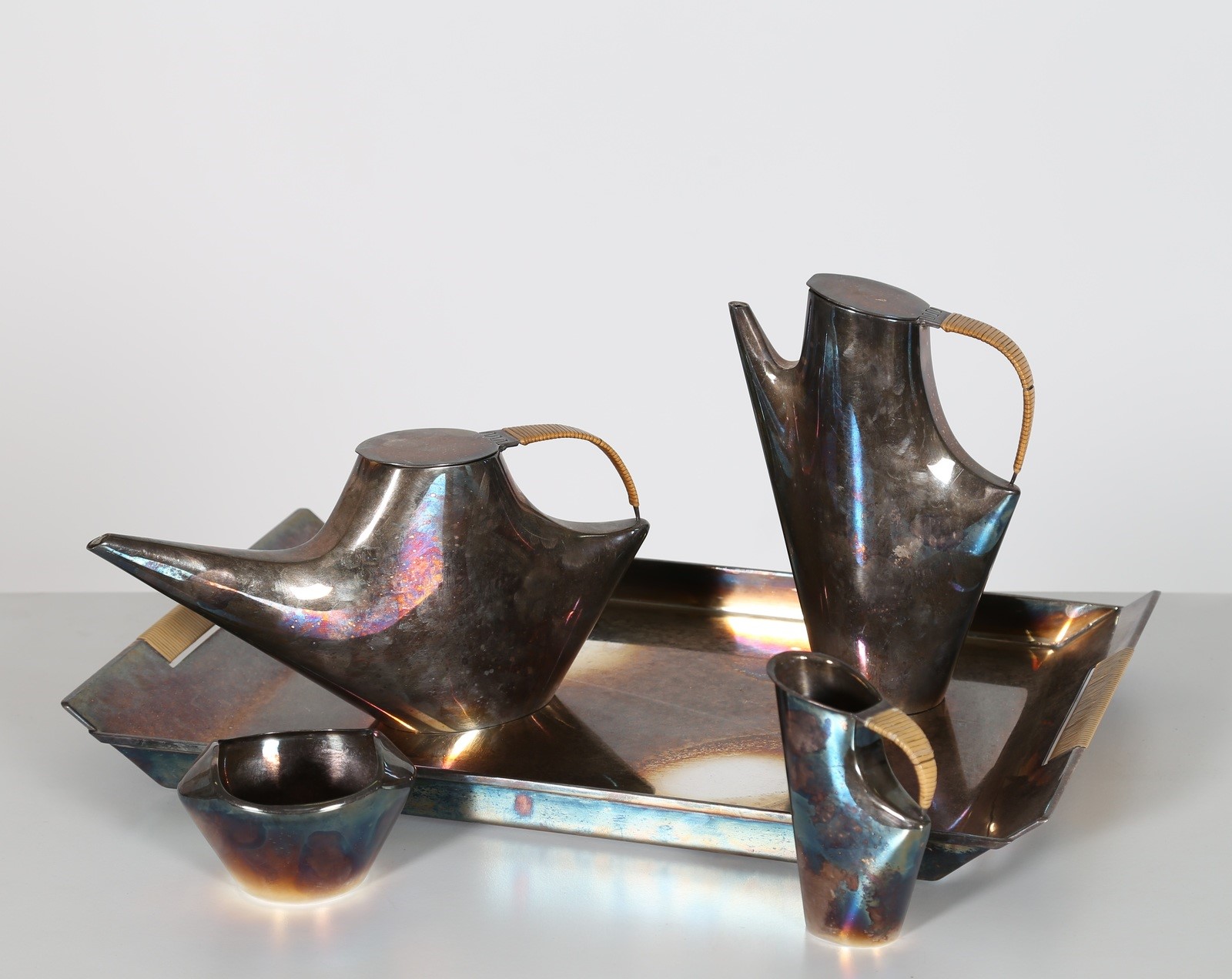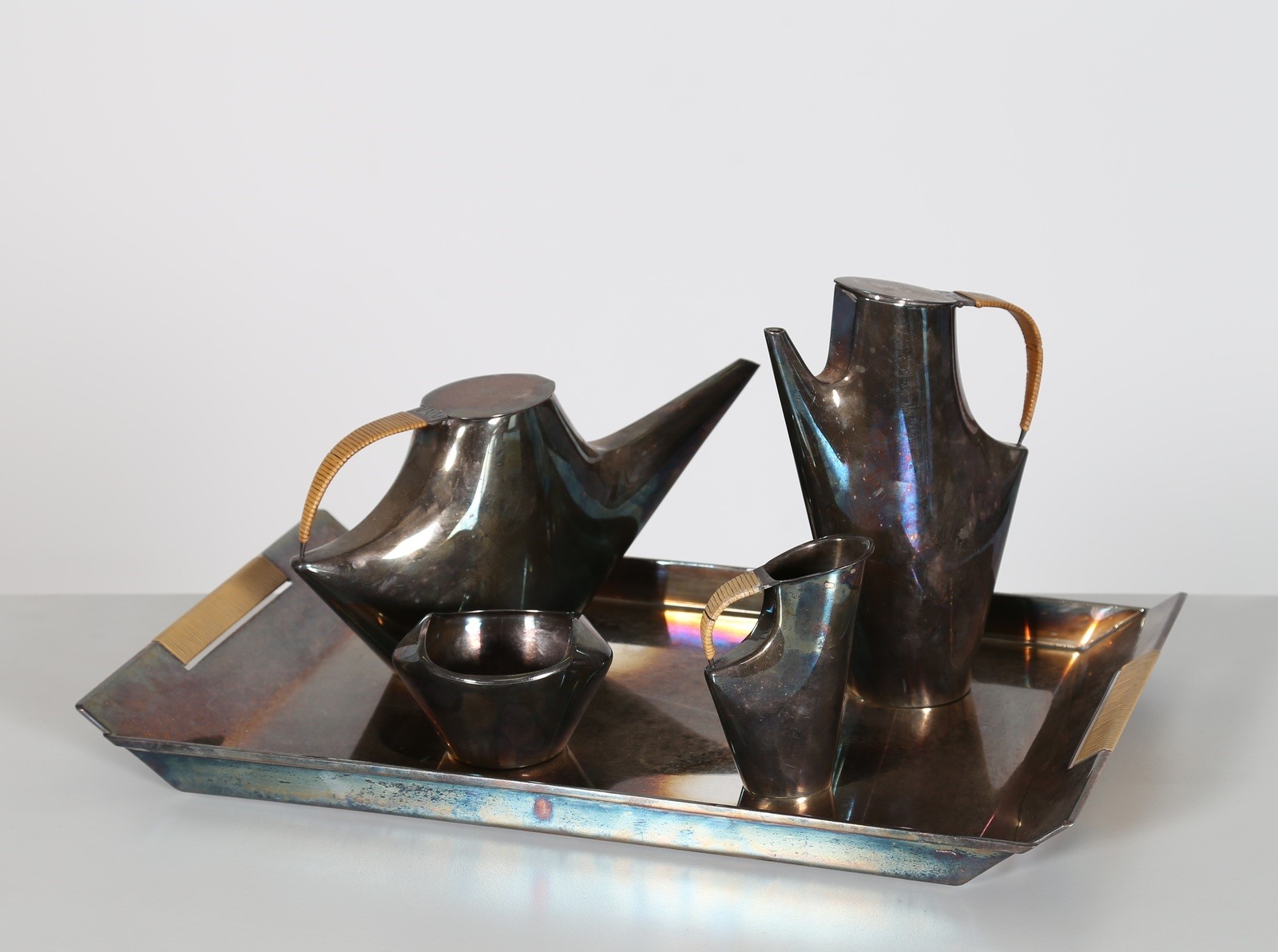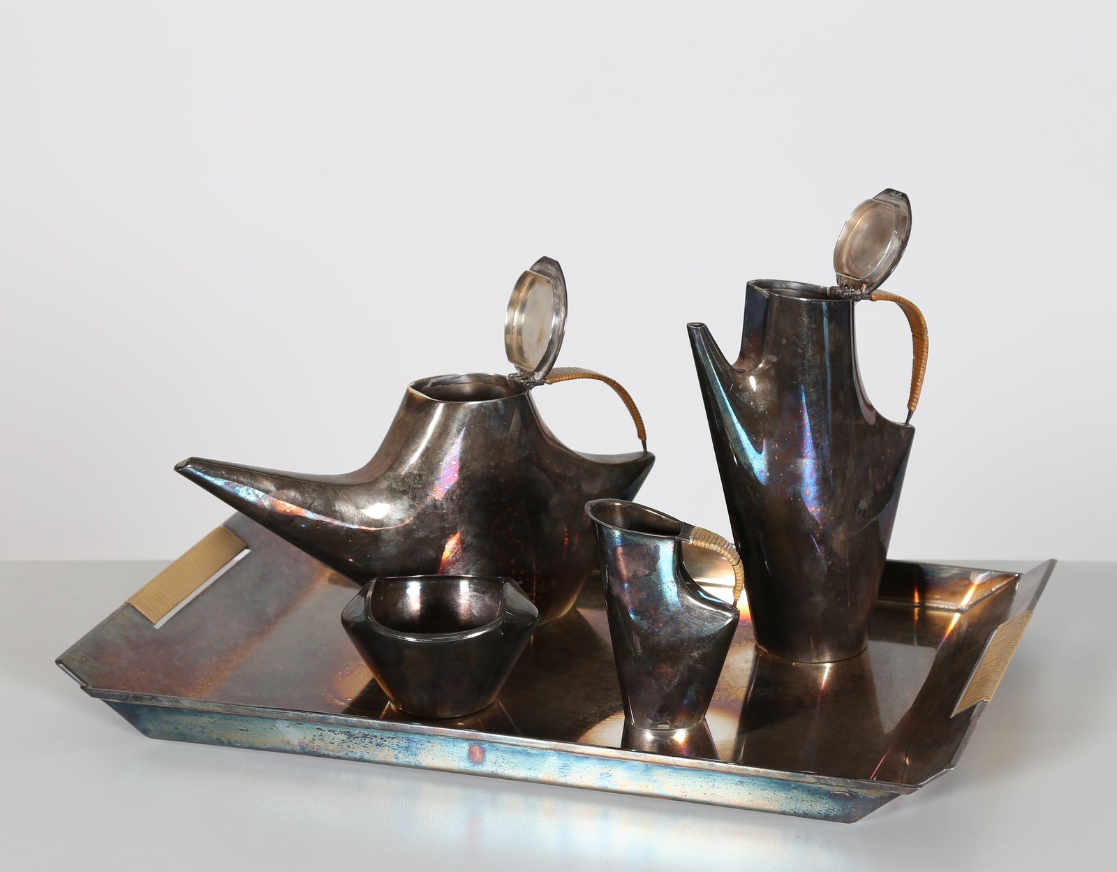 SABATINI LINO Servizio da tè e caffè Como composto da teiera, caffettiera, lattiera, zuccheriera e vassoio in metallo argentato con manici foderati in vimini. Pubblicazioni; F. Alison, R. De Fausto, L’Artidesign, il caso Sabattini, pag. 25, Electa Napoli, 1991. . . . vassoio, h 4, l 49,5, p 30,5, caffettiera h 22, l 17, p 6, teiera h 14,5, l 31, p6,5, lattiera h 12, l 9, p 4, zuccheriera h 6,5, l 11, p 9,