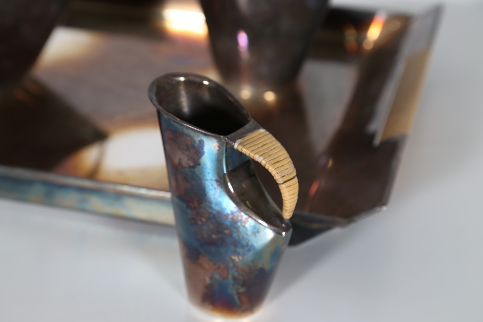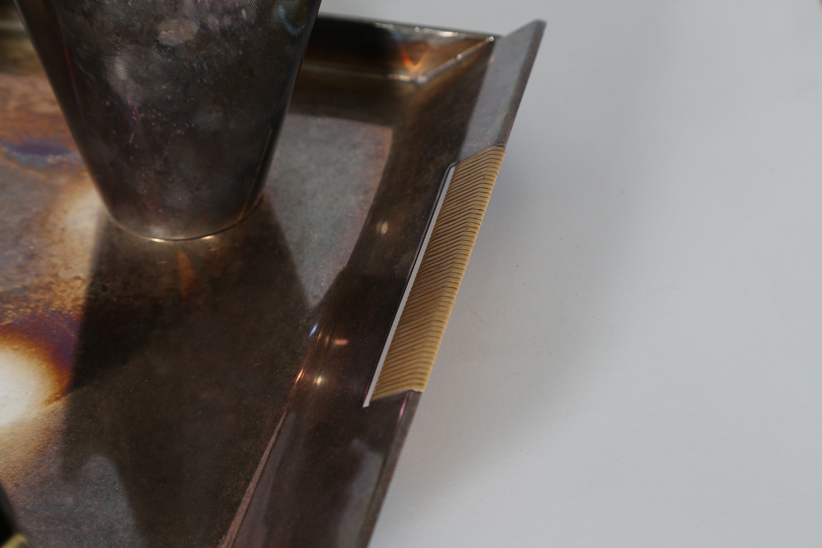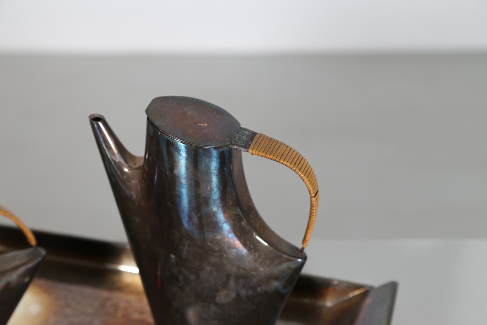 SABATINI LINO Servizio da tè e caffè Como composto da teiera, caffettiera, lattiera, zuccheriera e vassoio in metallo argentato con manici foderati in vimini. Pubblicazioni; F. Alison, R. De Fausto, L’Artidesign, il caso Sabattini, pag. 25, Electa Napoli, 1991. . . . vassoio, h 4, l 49,5, p 30,5, caffettiera h 22, l 17, p 6, teiera h 14,5, l 31, p6,5, lattiera h 12, l 9, p 4, zuccheriera h 6,5, l 11, p 9,