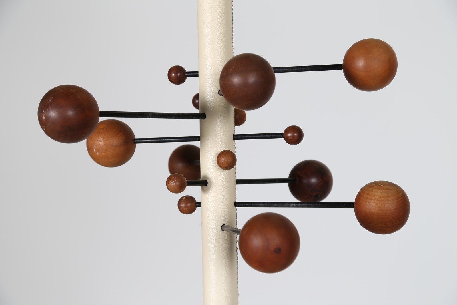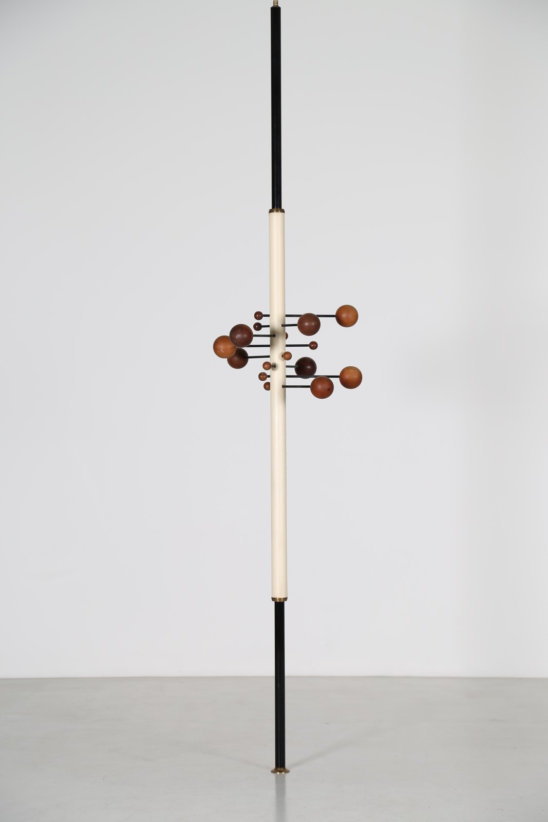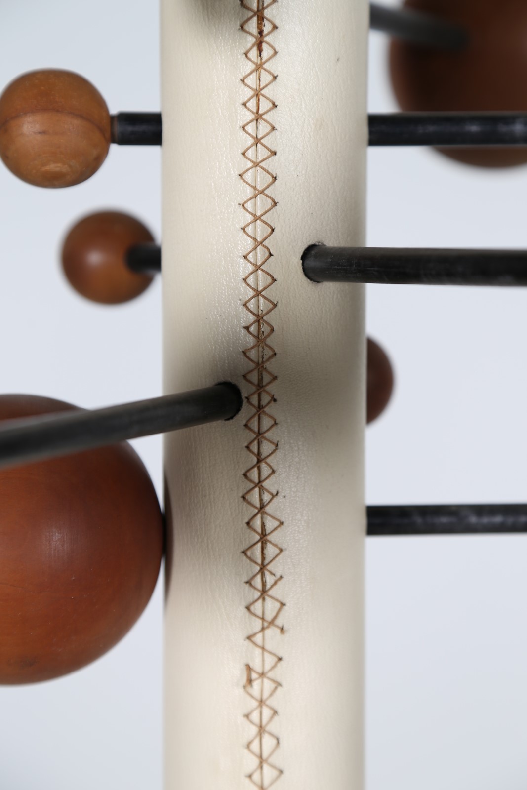 BORSANI OSVALDO (1911 - 1985) Appendiabiti girevole a piantana centrale con stelo struttura in alluminio verniciato e una porzione centrale rivestita in cuoio mentre gli appoggi sferici sono in diverse essenze di legno, mod. AT16 per Tecno 1961 . . Cm 60,00 x 320,00 x 60,00.