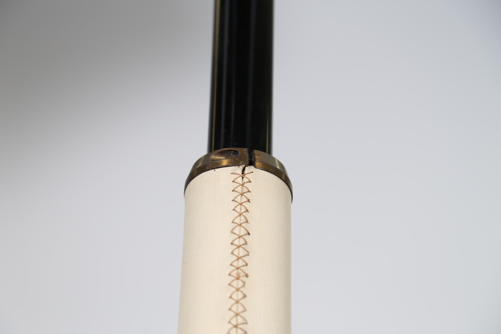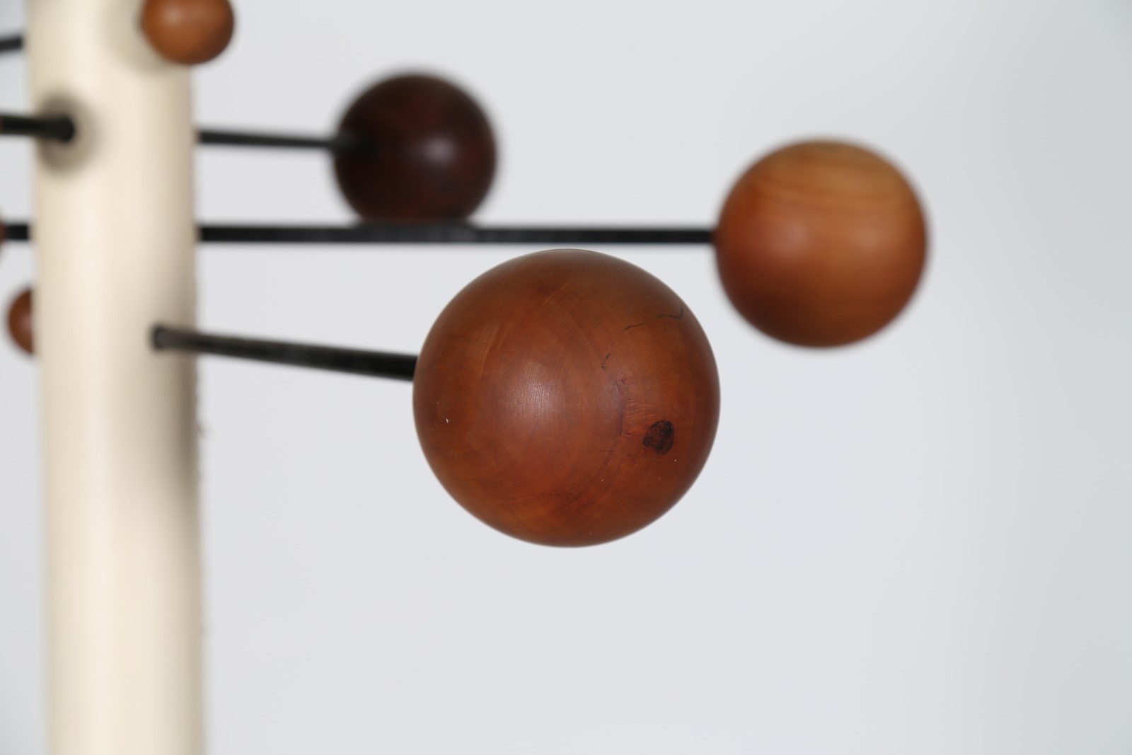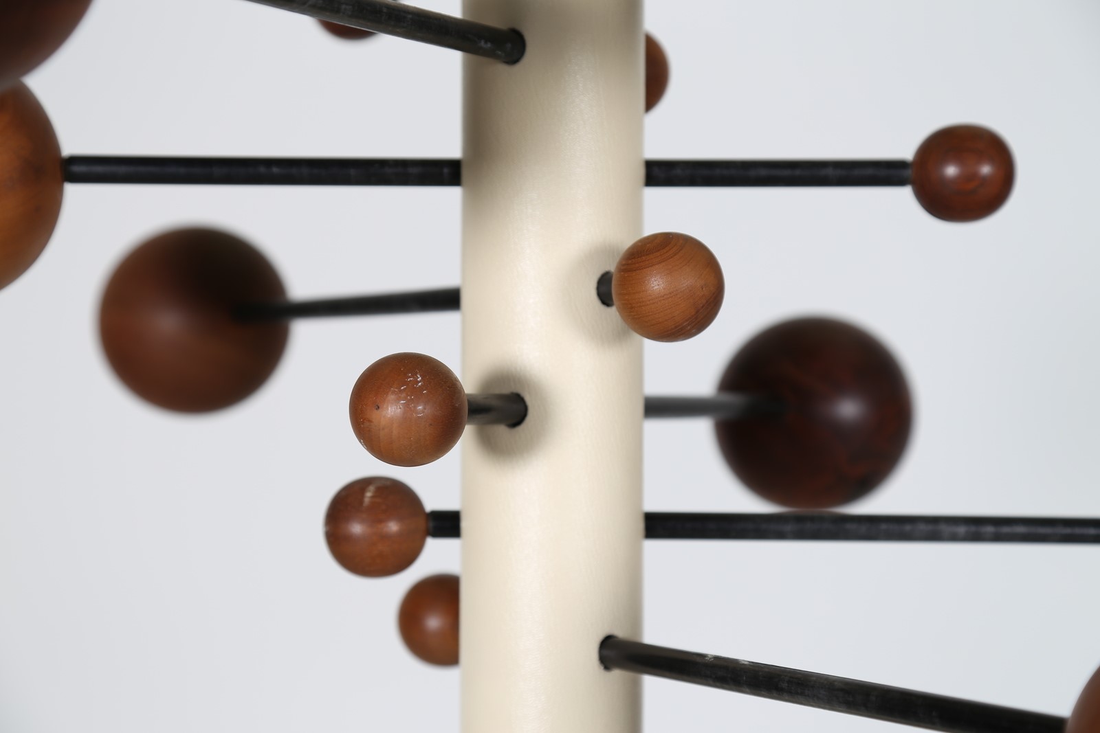 BORSANI OSVALDO (1911 - 1985) Appendiabiti girevole a piantana centrale con stelo struttura in alluminio verniciato e una porzione centrale rivestita in cuoio mentre gli appoggi sferici sono in diverse essenze di legno, mod. AT16 per Tecno 1961 . . Cm 60,00 x 320,00 x 60,00.
