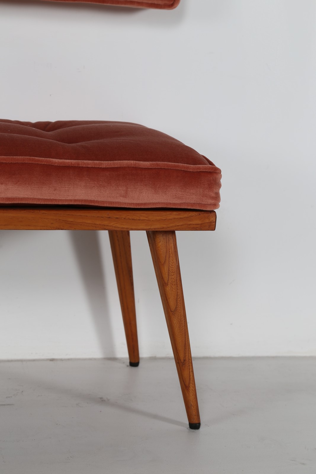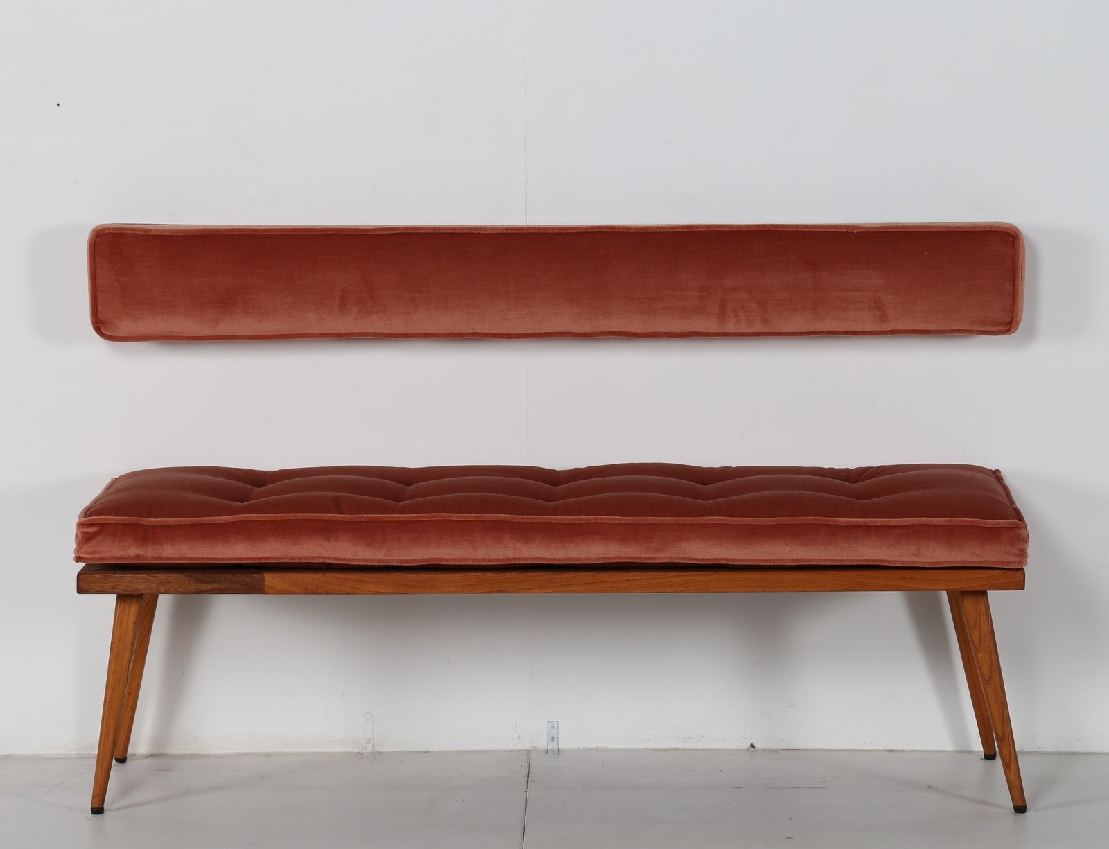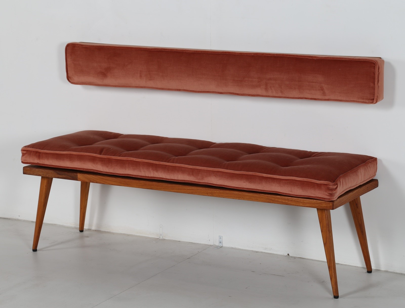 PARISI ICO (1916 - 1996) Panchetta con schienalino a muro in legno e tessuto, arredi dimora interamente arredata da Ico Parisi negli anni 50 in Verona. Disponibile certificato di autenticità, Archivio del Design di Ico Parisi. . . Cm 130,00 x 44,00 x 41,00. schienale H 16,5 L 135 P 8