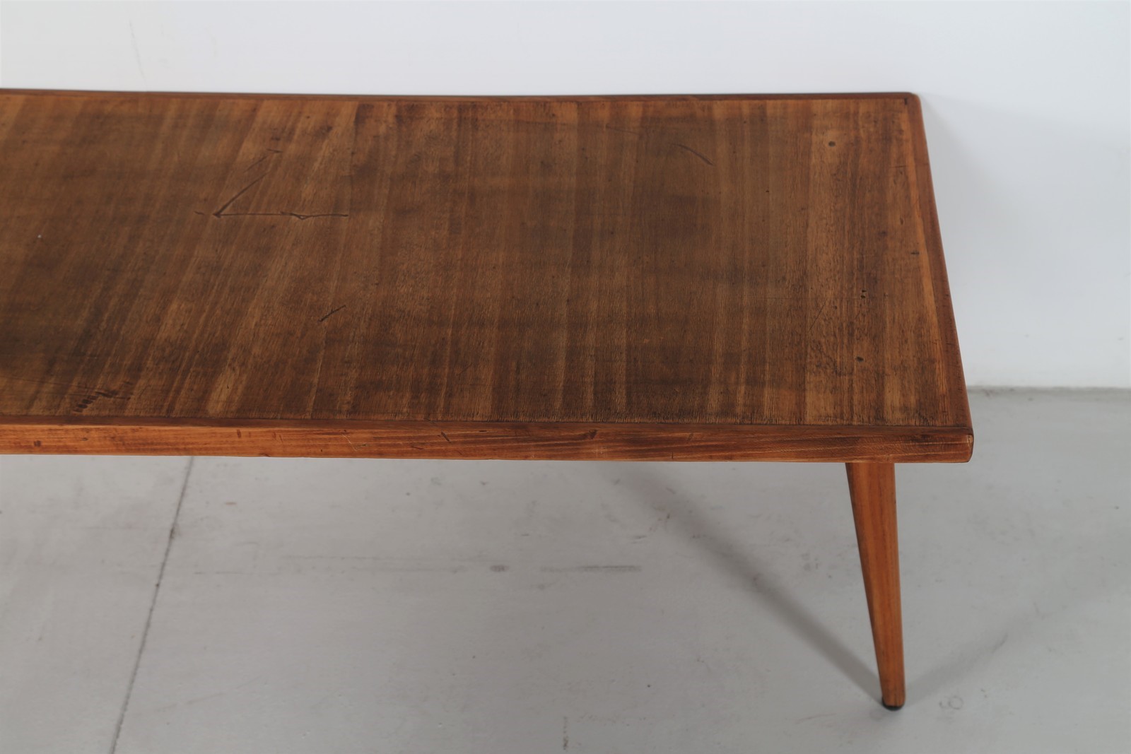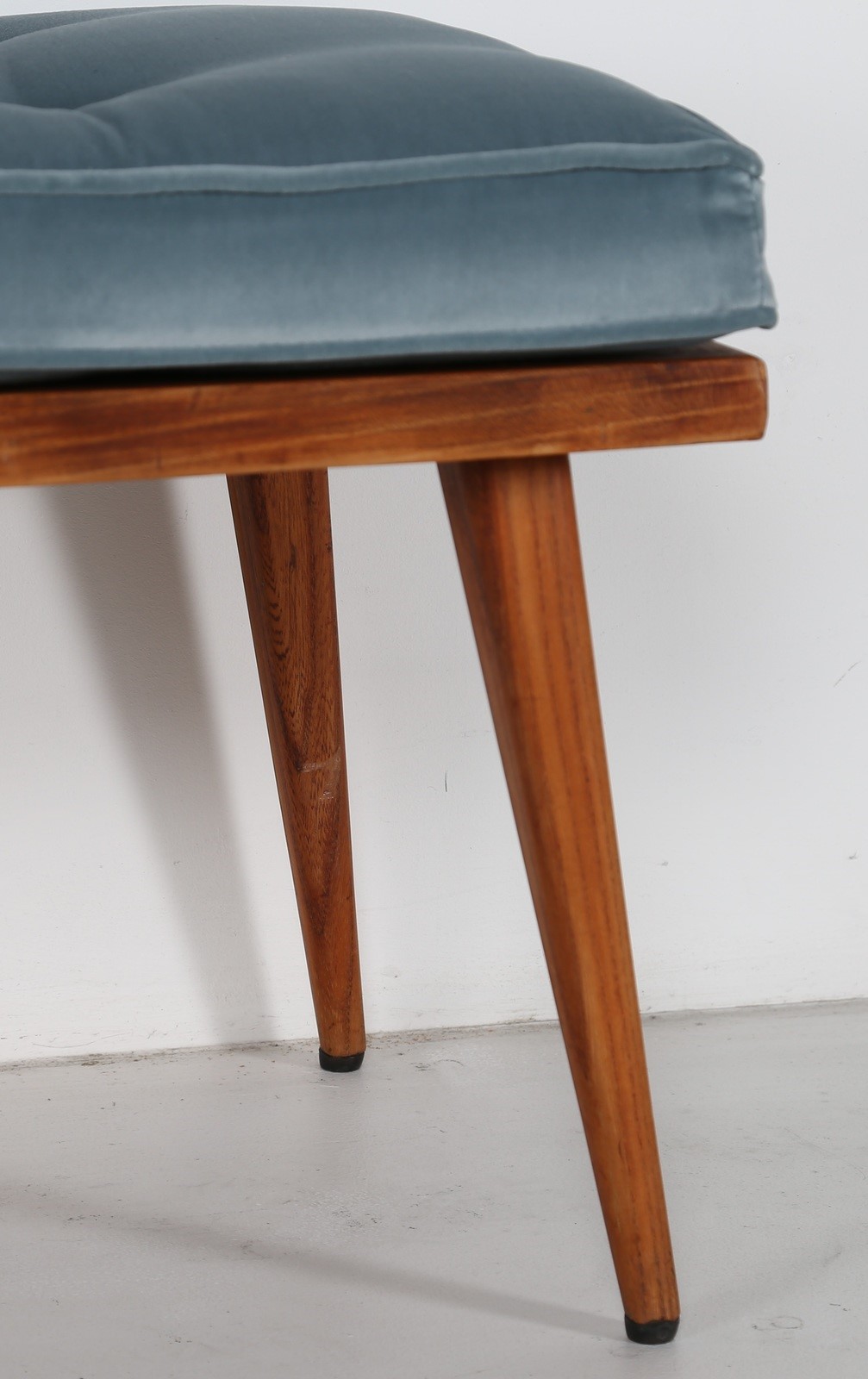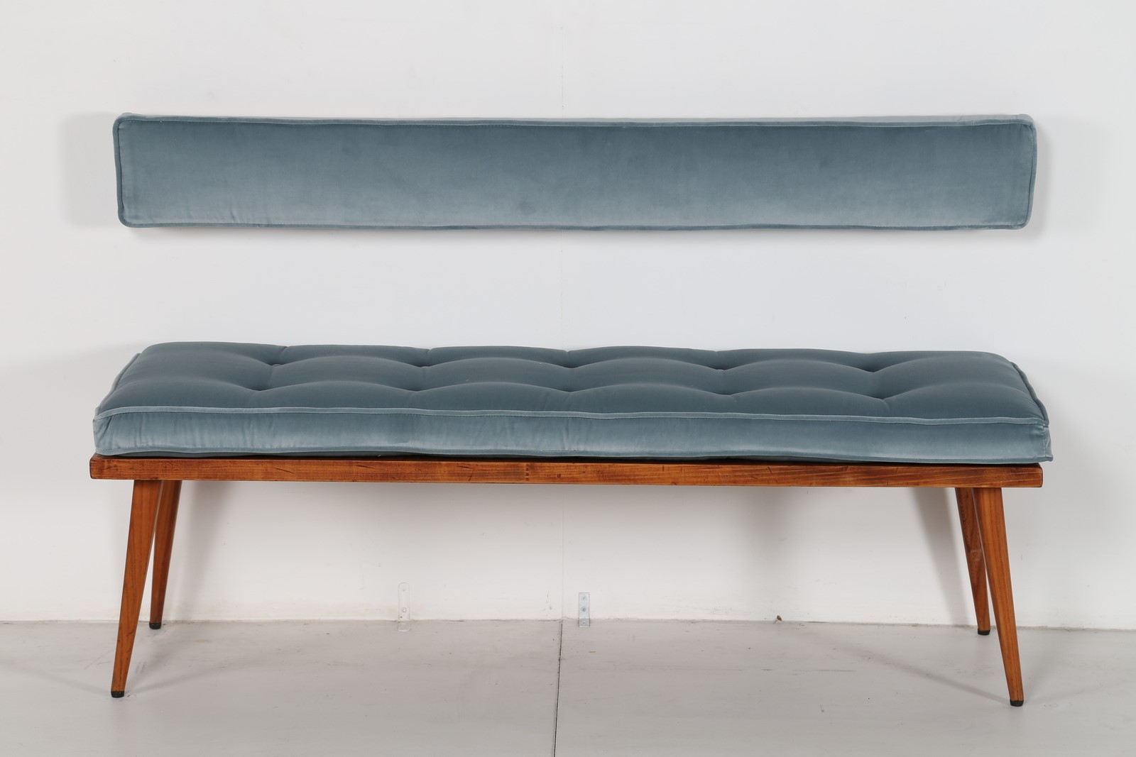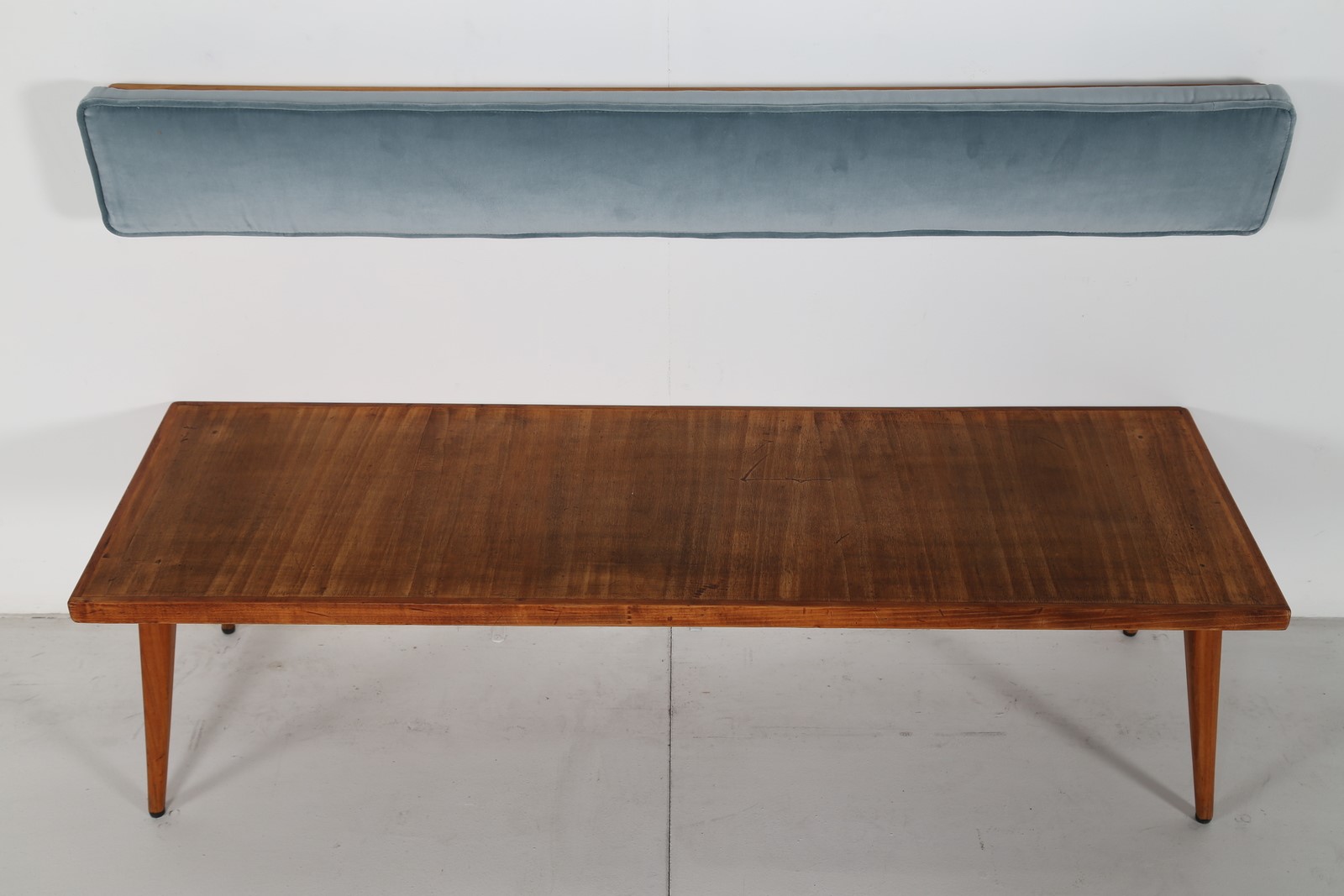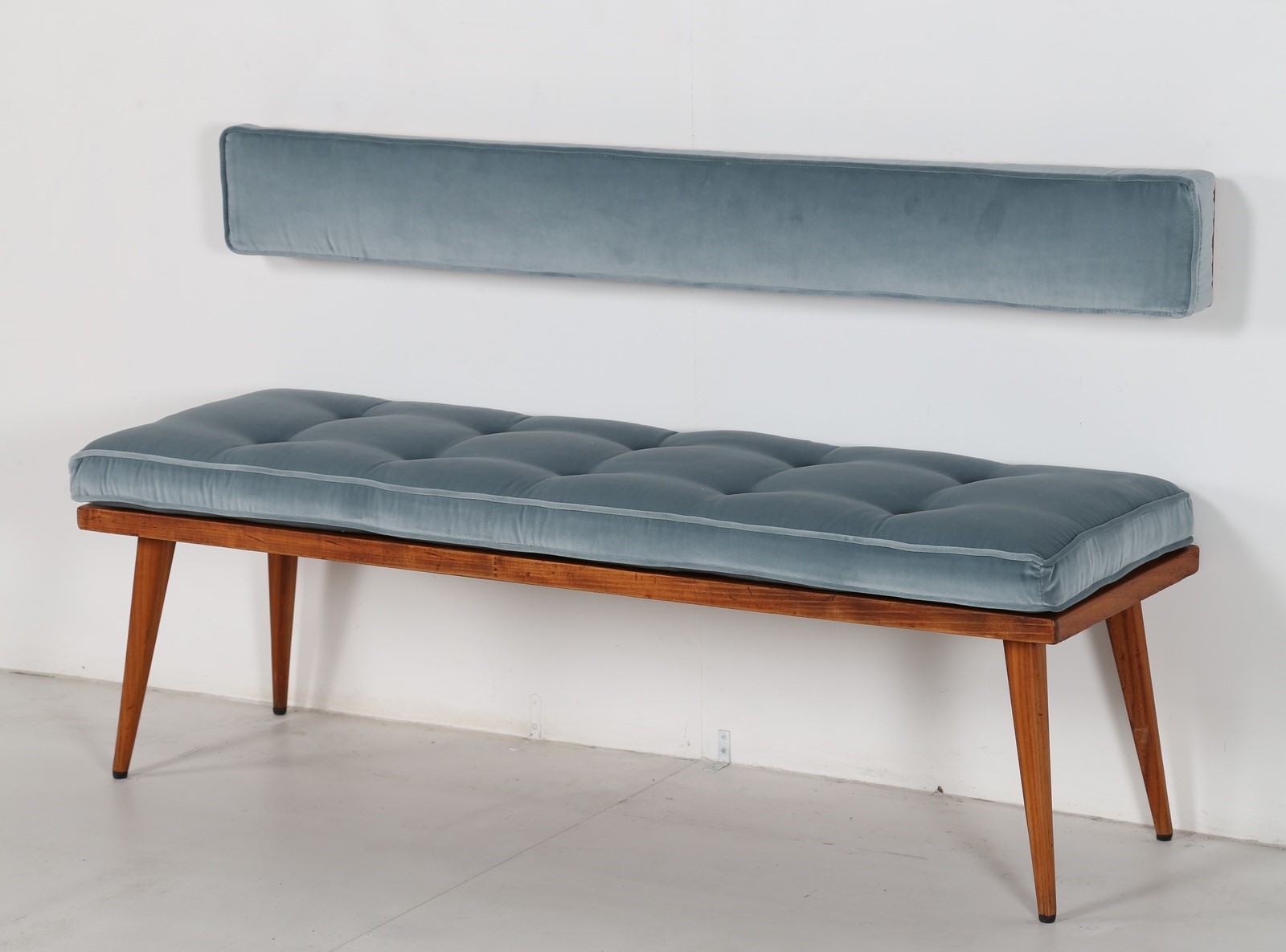 PARISI ICO (1916 - 1996) Panchetta con schienalino a muro in legno e tessuto, arredi dimora interamente arredata da Ico Parisi negli anni 50 in Verona. Disponibile certificato di autenticità, Archivio del Design di Ico Parisi. . Cm 130,00 x 44,00 x 42,00. schienale H 16 L 134 P 9