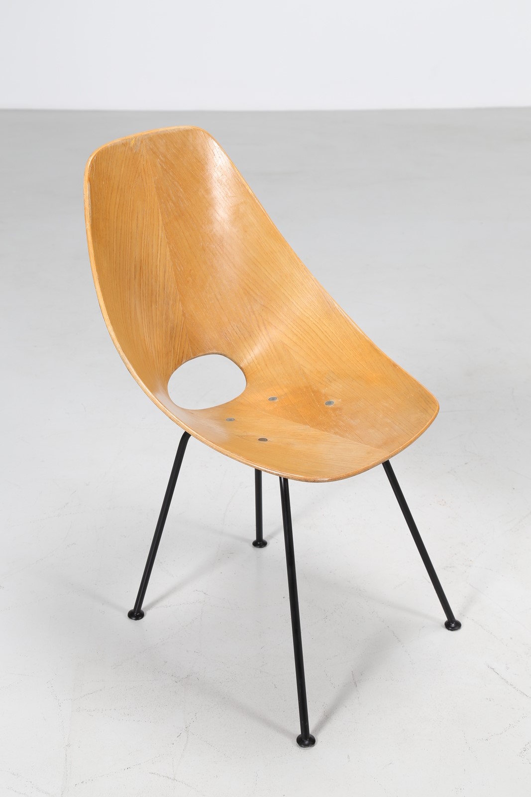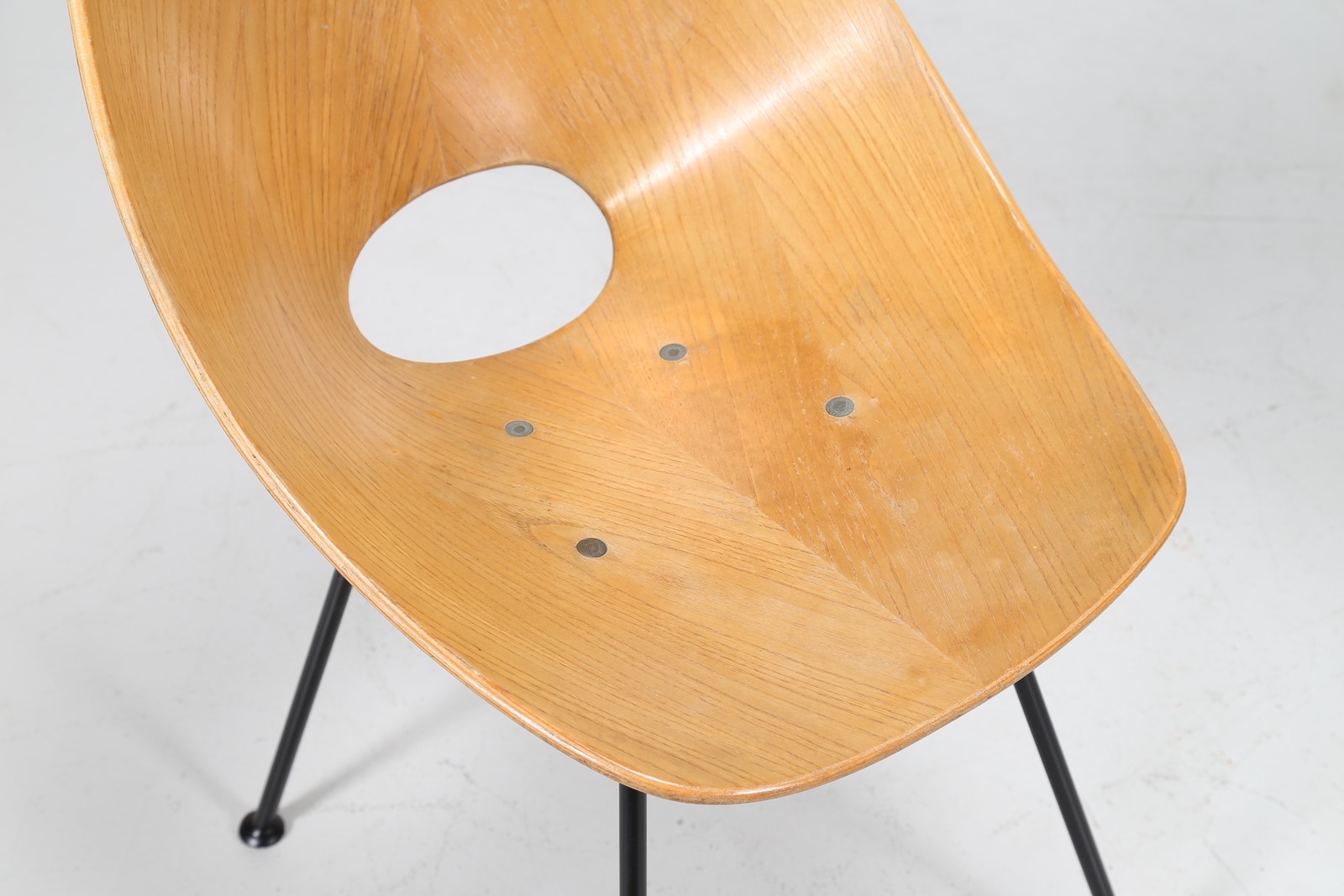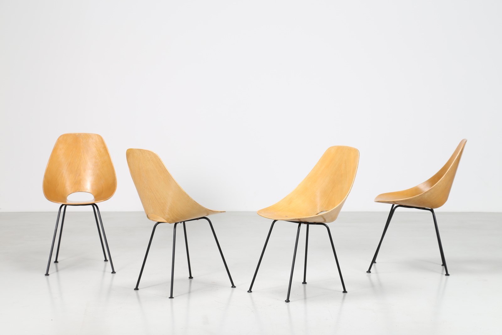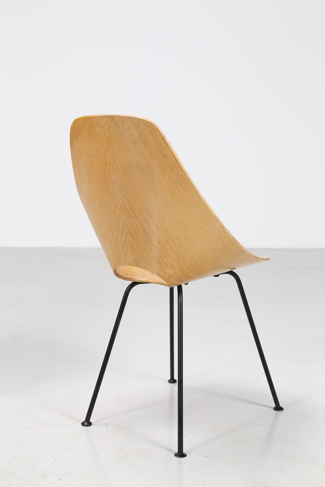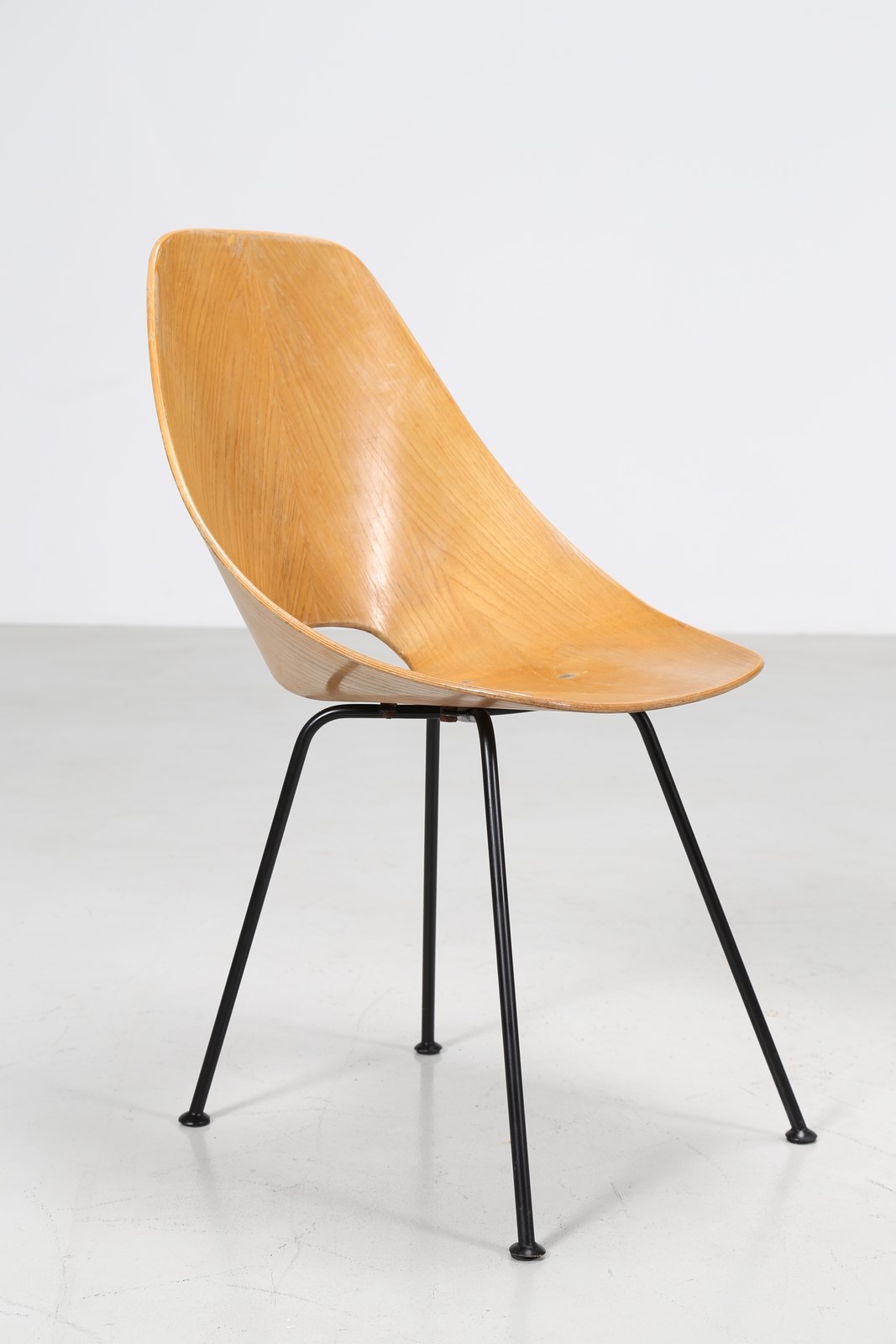NOBILI VITTORIO (n. 1935) Quattro sedie in compensato curvato e gambe in metallo laccato nero, per Fratelli Tagliabue anni '50. . -. Cm 46,00 x 84,00 x 53,00. Pubblicazioni; Domus n. 329, aprile 1957, pag. 34 (inserzione pubblicitaria)