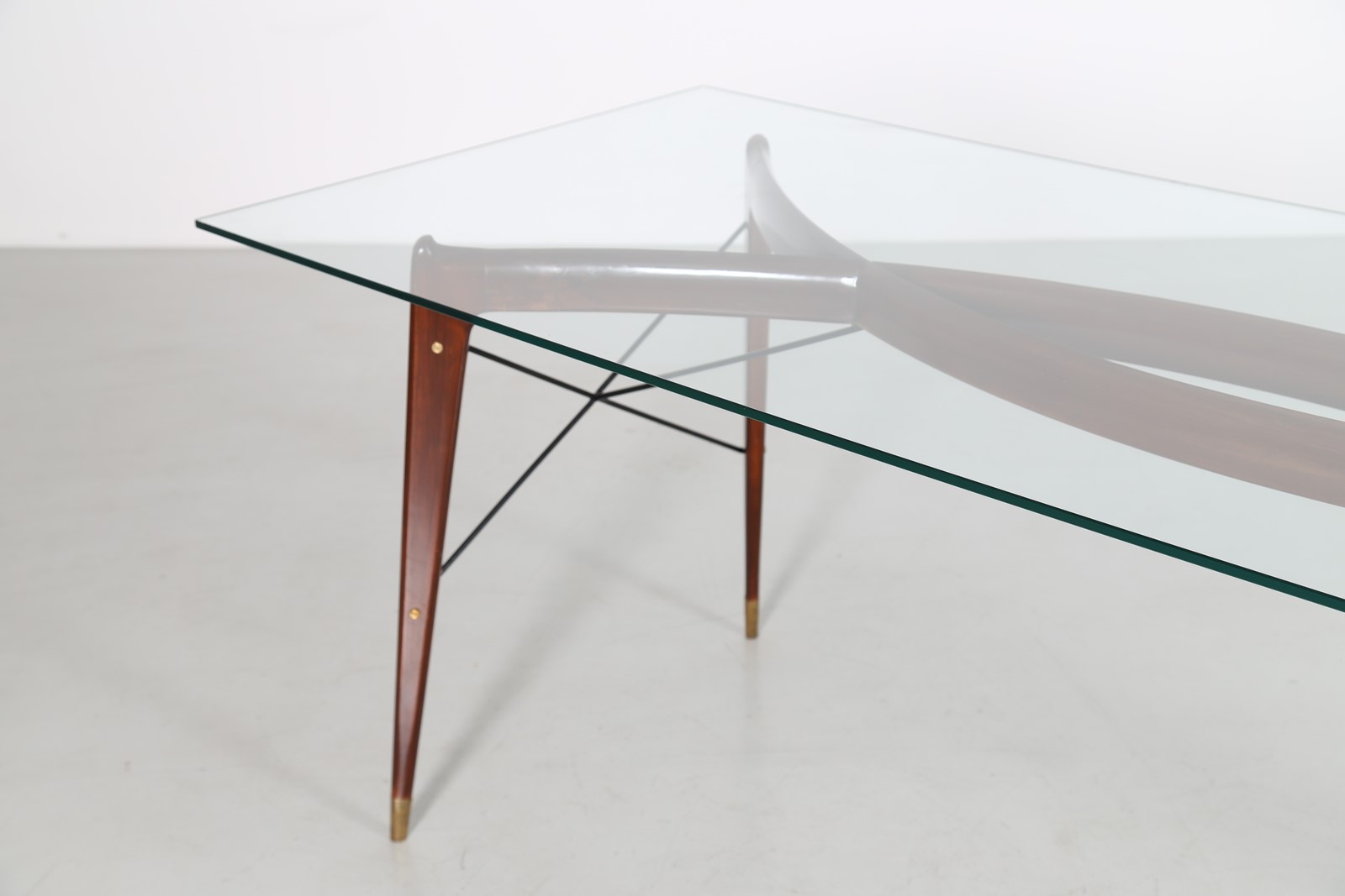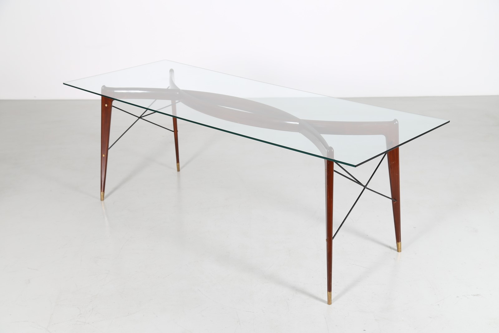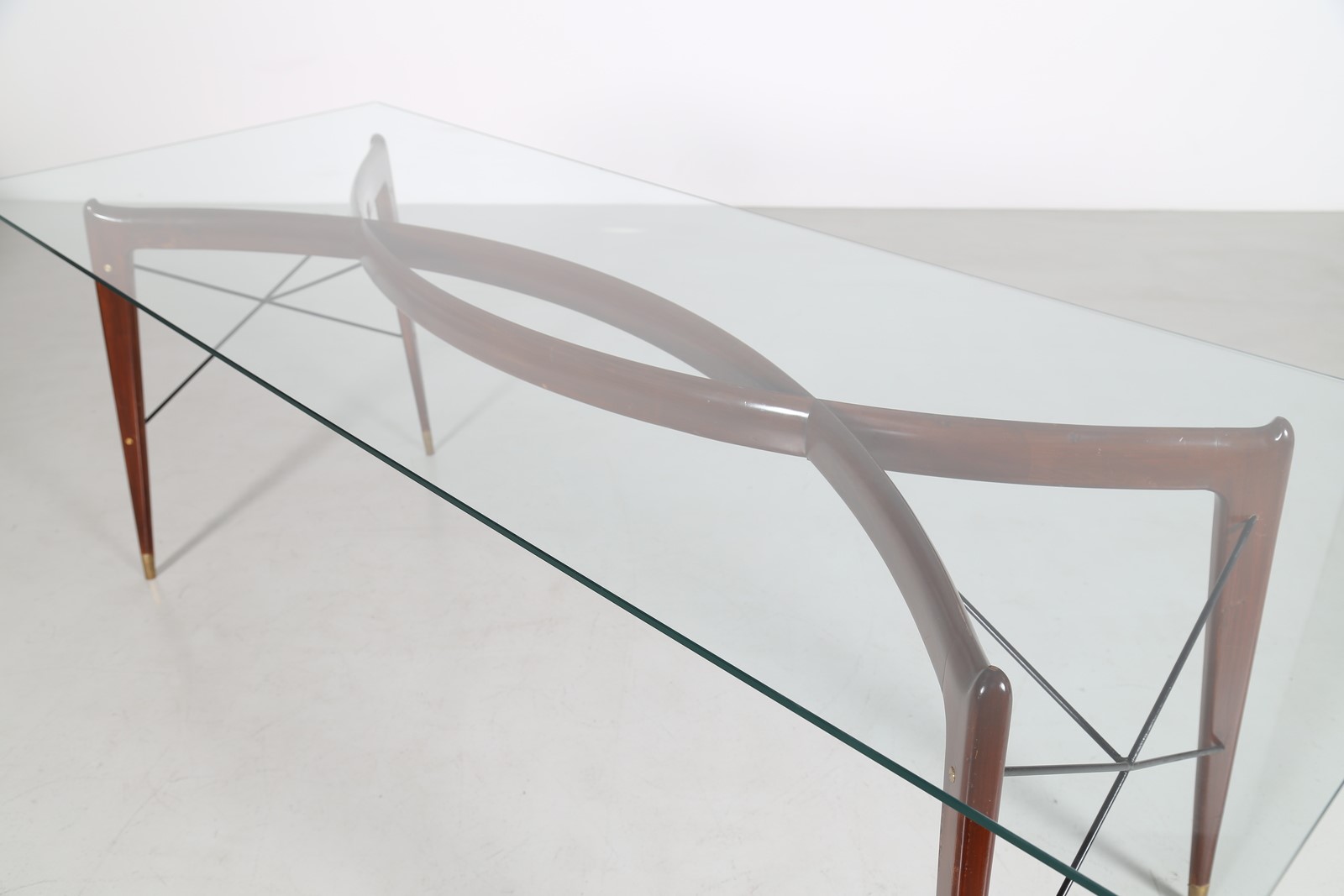 ANONIMO Tavolo in noce metallo e ottone con piano in cristallo, scuola brianzola anni 50. . Cm 220,00 x 79,00 x 85,00.