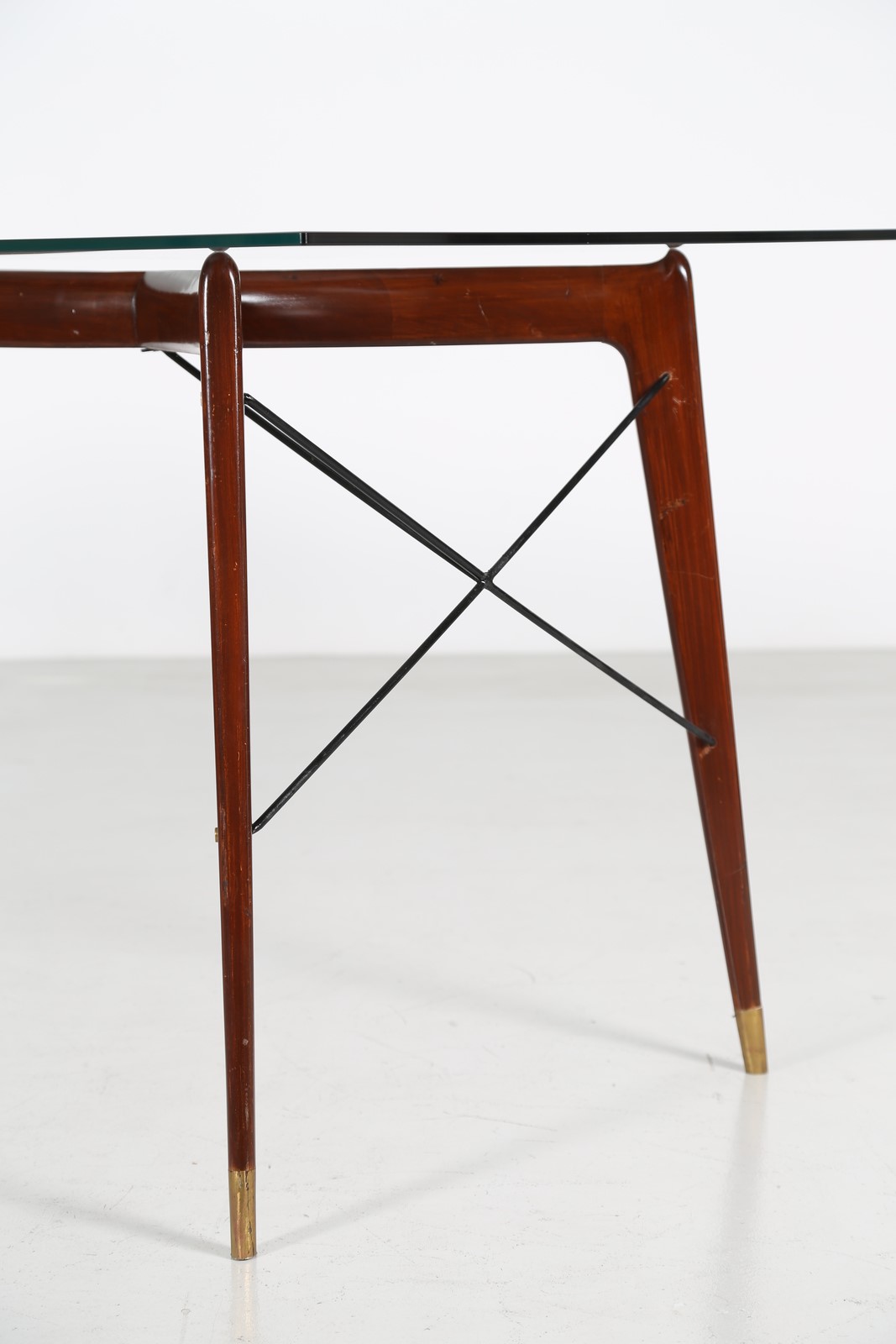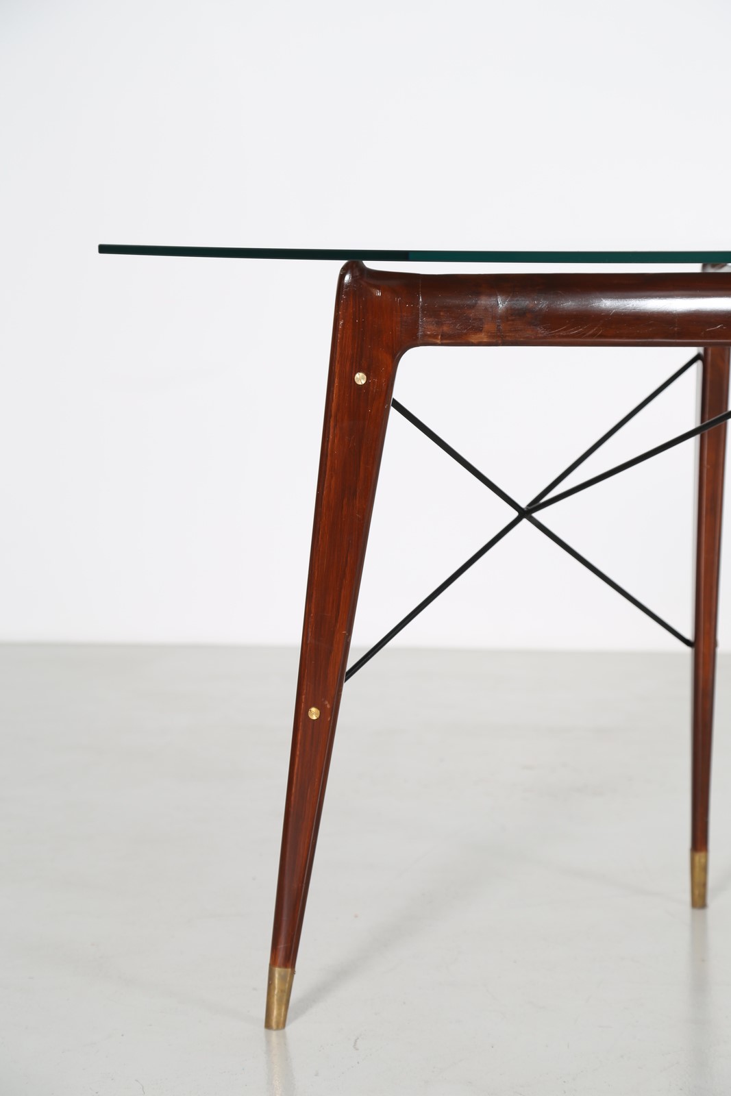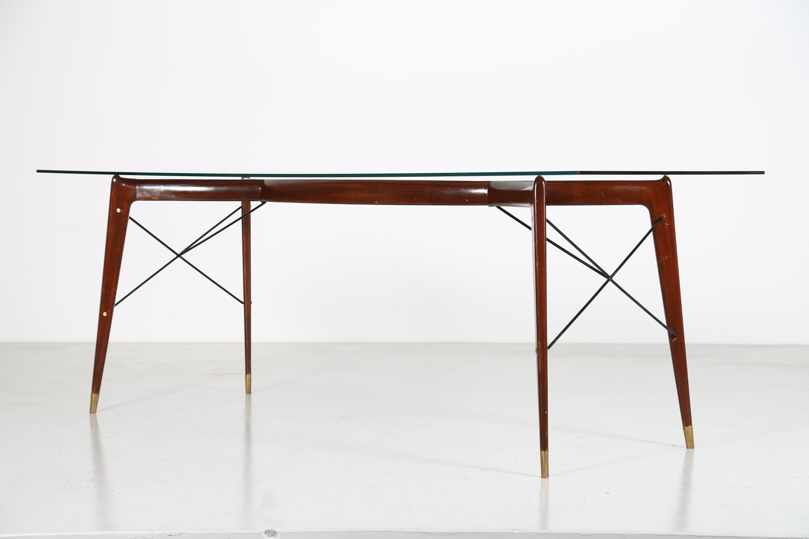 ANONIMO Tavolo in noce metallo e ottone con piano in cristallo, scuola brianzola anni 50. . Cm 220,00 x 79,00 x 85,00.