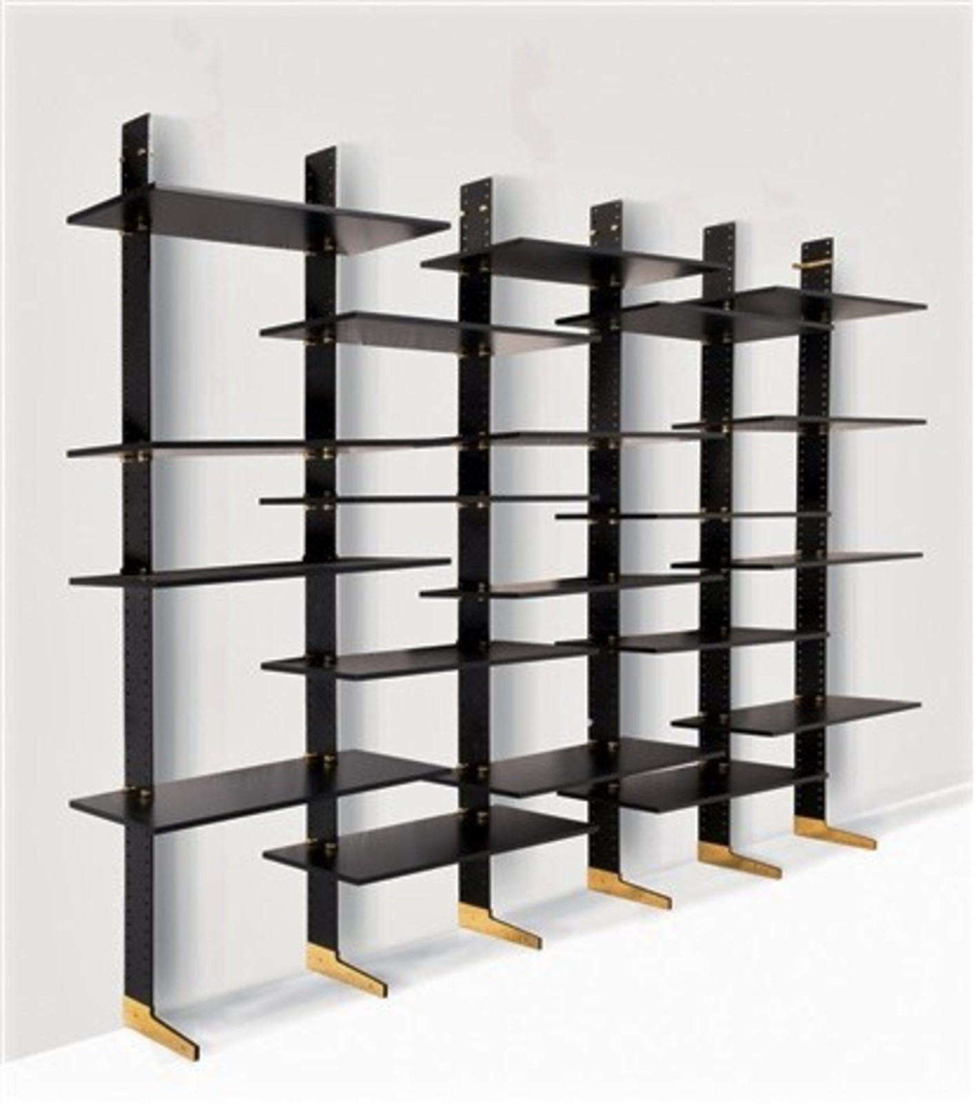 GARDELLA IGNAZIO (1905 - 1999) Libreria modulare con sette montanti e sei spazi, in metallo laccato, bulloni e piedini in ottone, mensole in legno laccato nero, per Azucena, dal 1955 al 1970. . -. . Pubblicazioni; Domus, n. 325, novembre 1956, rassegna; G. Gramigna, Repertorio del design italiano 1950-2000 per l'arredamento domestico, Allemandi, Torino 2007, p. 42.