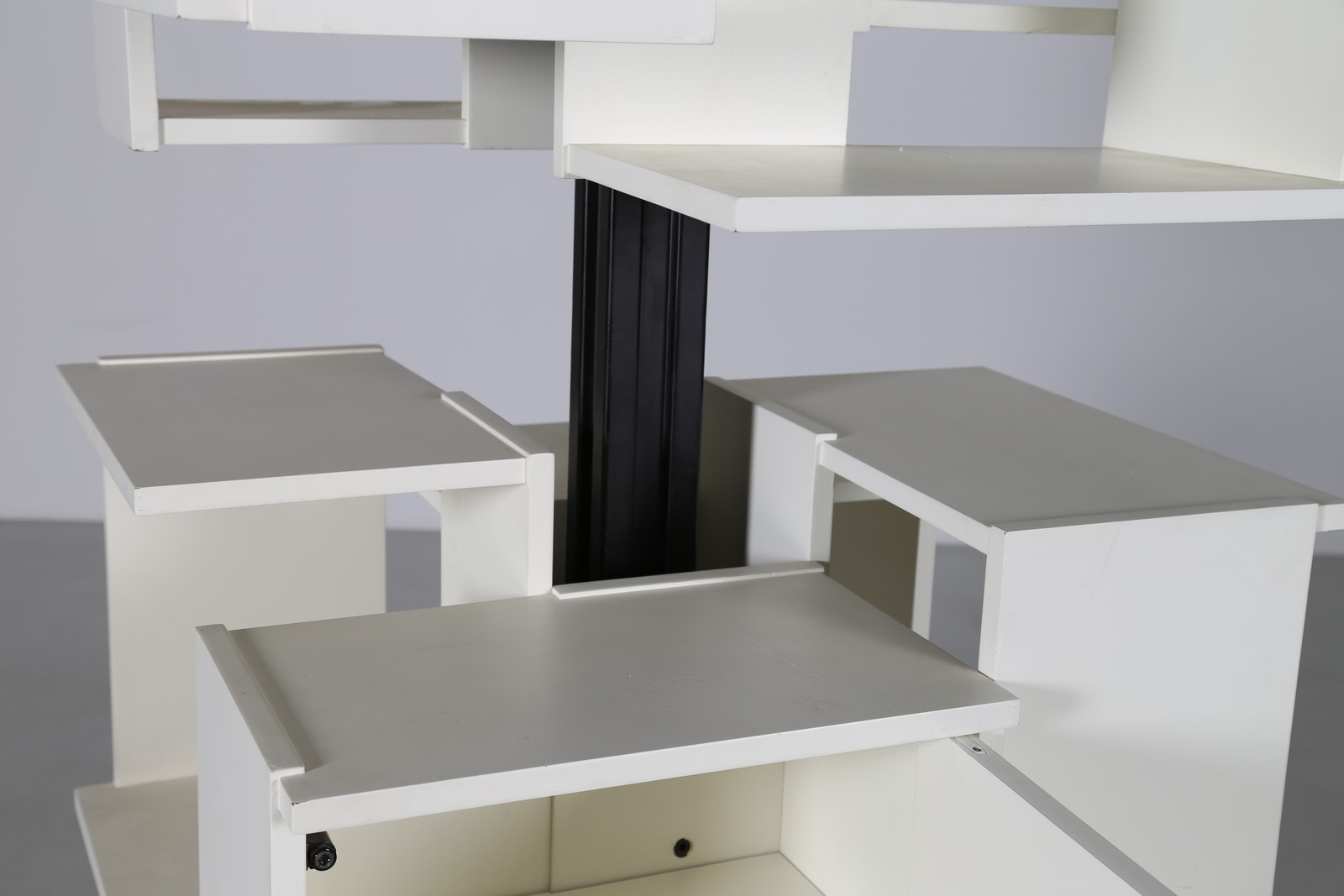 SALOCCHI CLAUDIO (1934 - 2009) Libreria da centro con elementi girevoli e contenitori laccati, su sostegno centrale in acciaio, per Sormani, 1960. . . . Pubblicazioni; G. Gramigna, Repertorio 1950-80, Mondadori, 1985, pag. 159.