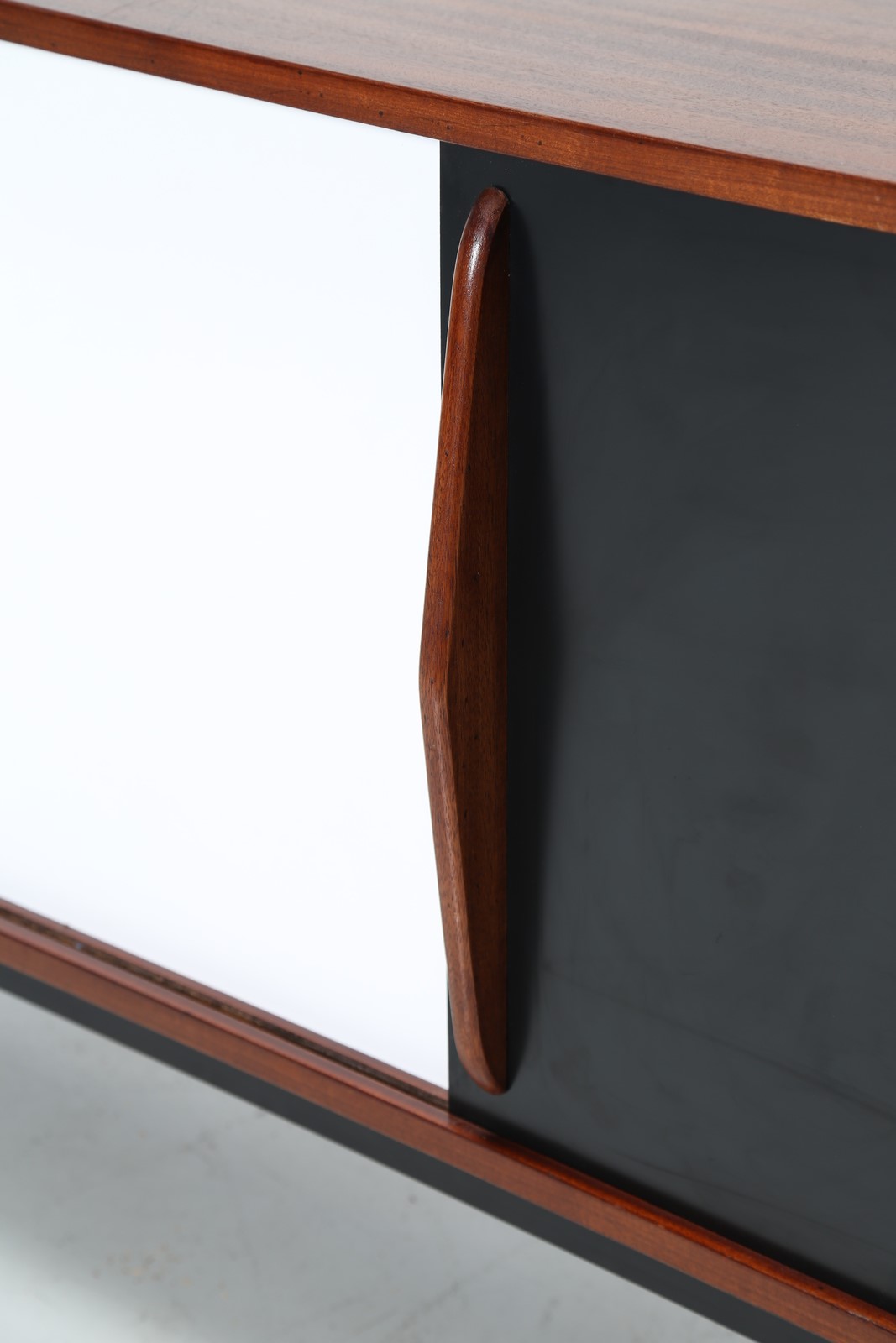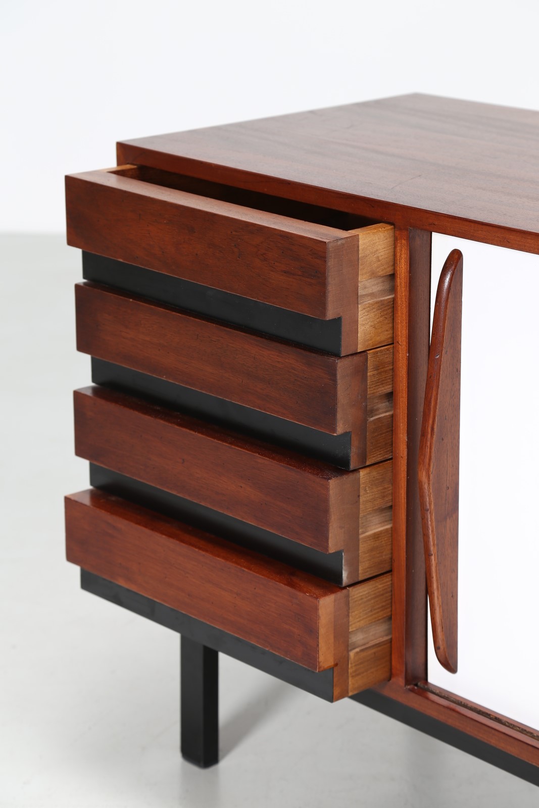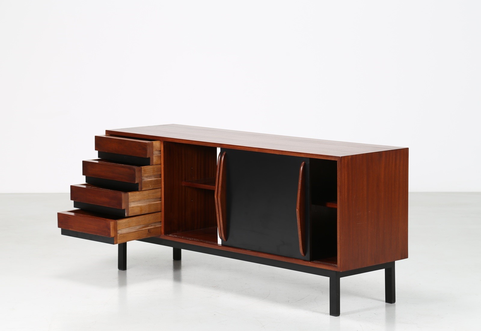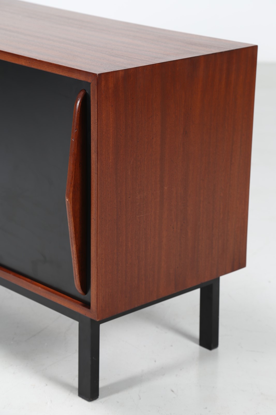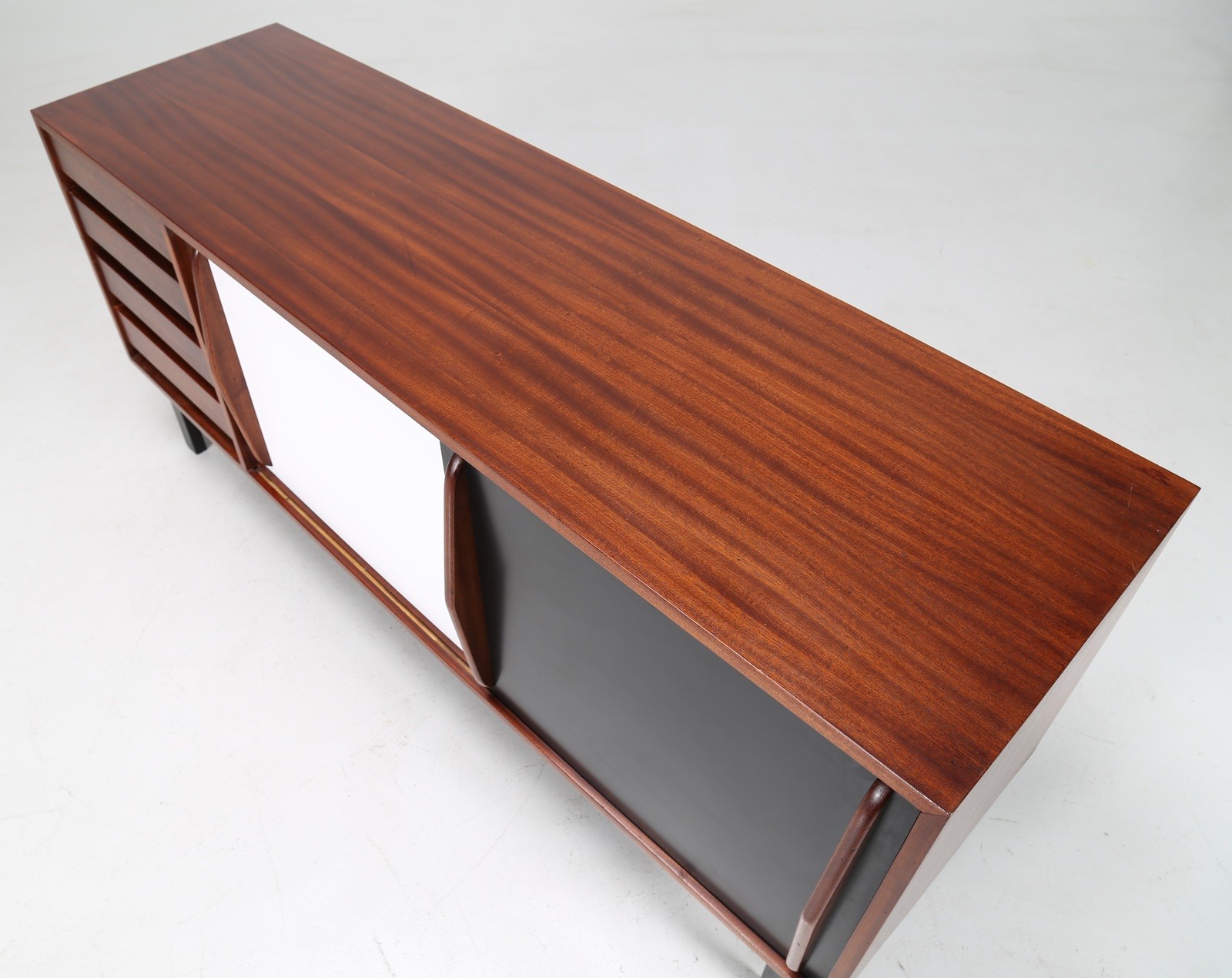 PERRIAND CHARLOTTE Credenza in mogano impiallacciato, ante scorrevoli rivestite in laminato plastico e metallo laccato, anni 50. . -. Cm 158,00 x 71,00 x 47,00. Pubblicazioni; Jacques Barsac, Charlotte Perriand l’oeuvre complète volume 3 1956-1968, Norma, 2017, pag. 118.
