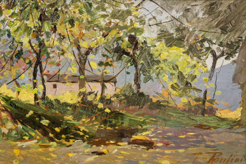 Ferruccio Rontini (Firenze Livorno 1964) Campagna, Olio su tavola, cm. 18x27. Firmato in basso a destra.