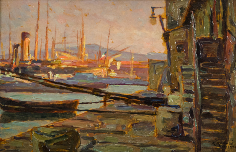 Renuccio Renucci (Livorno Livorno 1947) Porto, anni '20 Olio su tavola, cm. 15x22,5. Firmato in basso a destra. Esposizione: Antologica Duemiladodici, Galleria d'Arte Goldoni, Livorno, 24 Novembre - 29 Dicembre 2012, pubblicato sul catalogo della mostra a pag. 28. Certificato di Autenticità e Provenienza Galleria d'Arte Goldoni, Livorno.