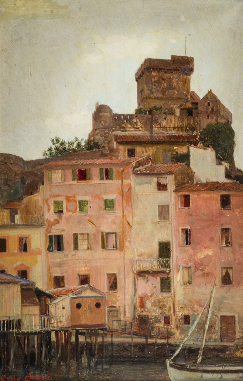 Carlo Chiostri (Firenze 1939) Paesaggio , Olio su cartone, cm. 34x22. Firmato in basso a sinistra.