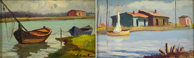 Gino Centoni (Livorno 1960) Lotto unico di due opere, -"Paesaggio", Olio su tavola, cm. 8,5x13,5, firmato in basso a destra; -"Paesaggio", Olio su tavola, cm. 8,5x13,5, firmato in basso a destra.