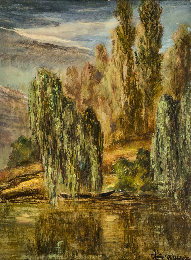 Ottorino Campagnari (1987) Paesaggio, 1953 Olio su faesite, cm. 40x30. Firmato in basso a destra. Sul verso: firma, data e titolo.